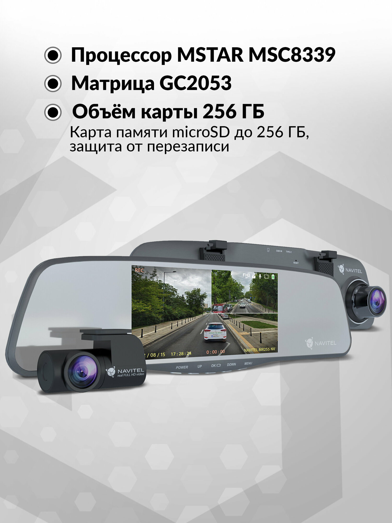 MR255 Night Vision — зеркало заднего вида c видеорегистратором и дополнительной камерой заднего вида. Устройство поддерживает двухканальную запись в формате Full HD 1920×1080, сохраняя снятые материалы на карту памяти объемом до 256 Гб. Оно оснащено 5-дюймовым IPS-дисплеем, позволяющим просмотреть записанные видеофайлы прямо на экране видеорегистратора. Удобные крепления позволяют легко и быстро установить видеорегистратор на штатное зеркало заднего вида, что делает его практически незаметным снаружи.
