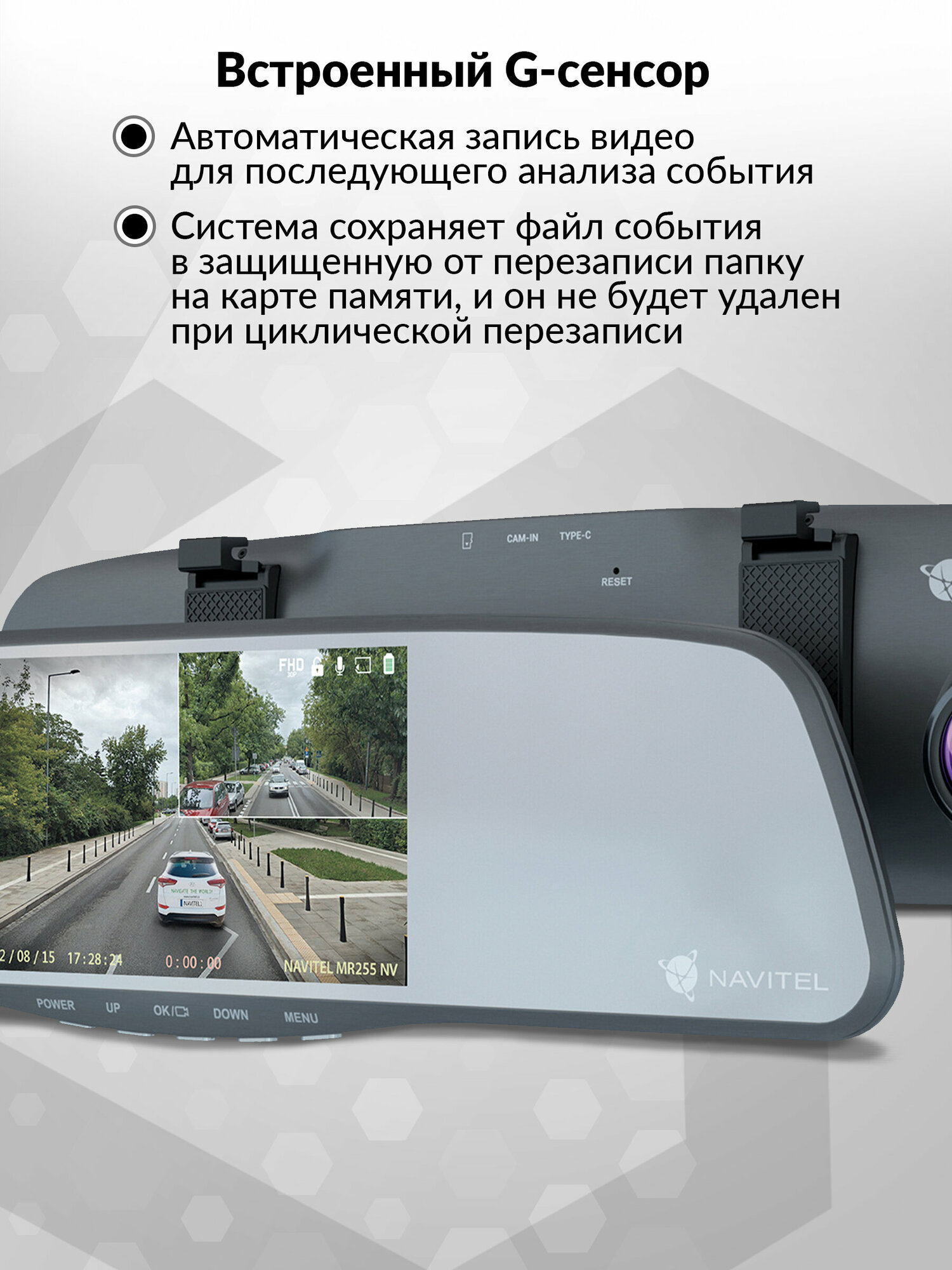 оснащен встроенным G-сенсором, который специальным образом маркирует видео, сделанное в нештатных ситуациях во время движения или на парковке**. В случае резкого маневра или удара по автомобилю, система сохраняет файл события в защищенную от перезаписи папку на карте памяти.