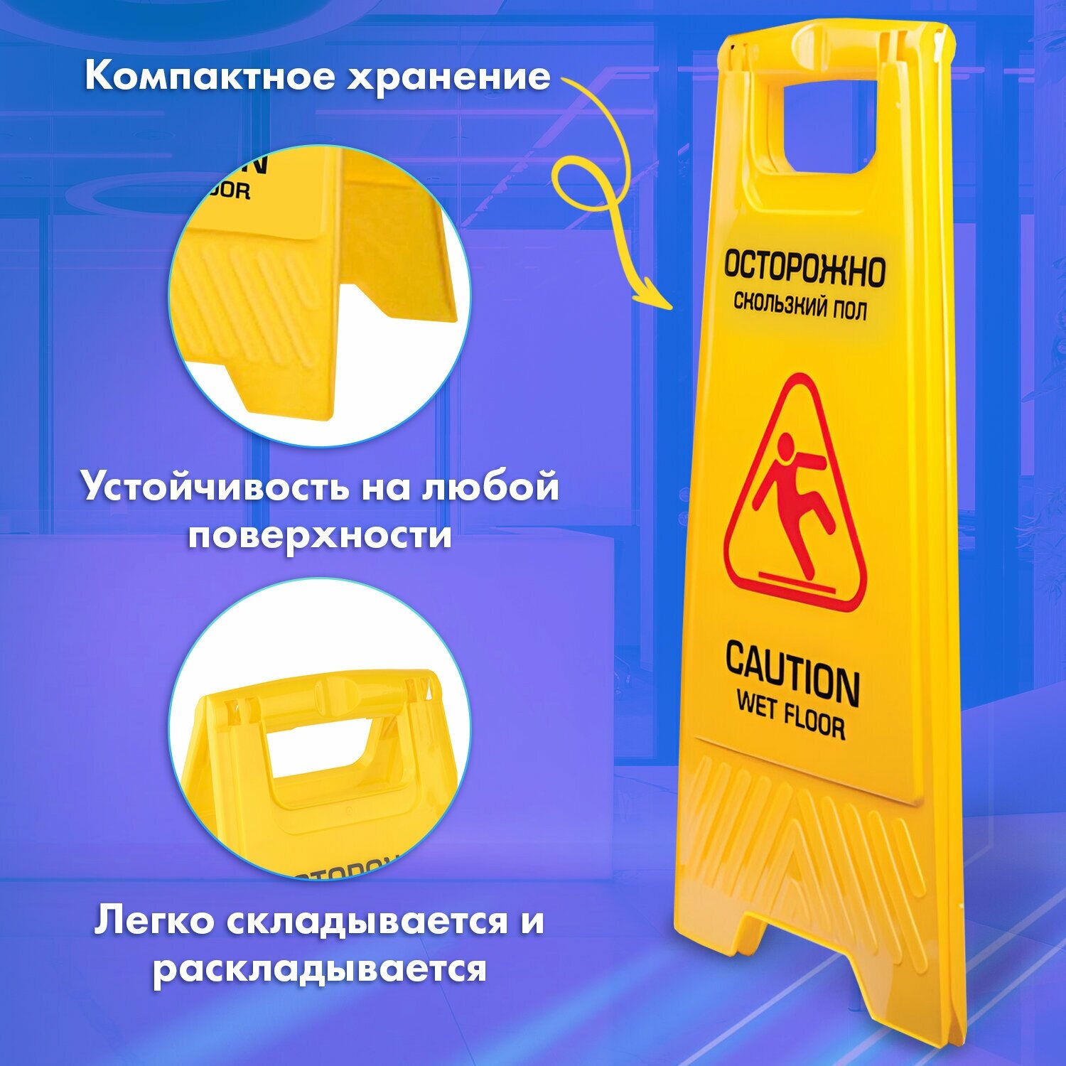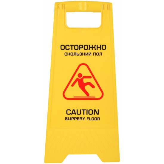 Знак предупреждающий Осторожно! Скользкий пол! LAIMA PROFESSIONAL предназначен для привлечения внимания и обеспечения безопасности в местах массового скопления людей. Выставляется при проведении влажной уборки. Знак выполнен из ударопрочного пластика, легко складывается и раскладывается. В сложенном виде имеет размер 62х30 см. Информация написана на русском и английском языках. Яркий желтый цвет позволяет увидеть знак на большом расстоянии.