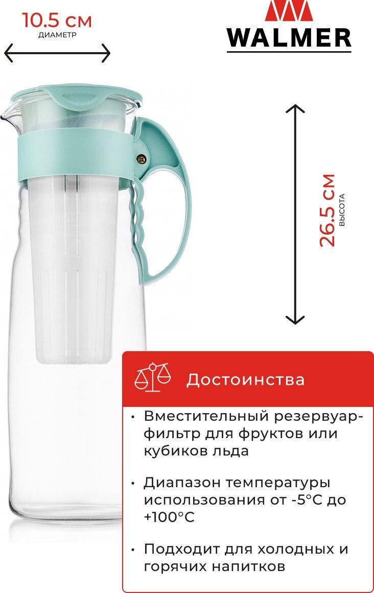 Насладитесь вкусными напитками с помощью универсального кувшина с фильтром FOREST. Вместительный резервуар-фильтр удобен для наливания напитка без попадания кусочков фруктов или кубиков льда в бокал. Вы также можете снять резервуар и пользоваться кувшином без него, когда фрукты и ягоды отдали все соки и напиток настоялся. Кувшин изготовлен вручную из термостойкого стекла, которое выдерживает температуру от -5°С до 100°С. Это позволяет наливать в него не только холодные, но и горячие напитки. Кувшин можно мыть в посудомоечной машине.