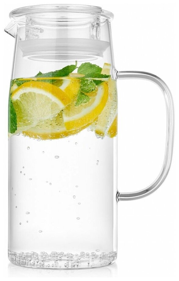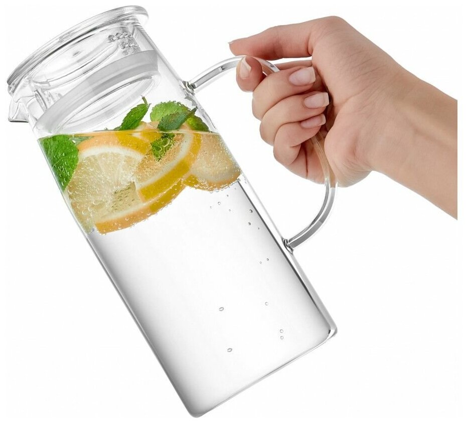 Кувшин изготовлен из термостойкого боросиликатного стекла, которое выдерживает температуру от -20°С до 280°С, что позволяет использовать его и для холодных, и для горячих напитков. Удобная ручка не нагревается и позволяет комфортно пользоваться кувшином. Крышка оснащена силиконовым уплотнителем, который препятствует открытию кувшина при наливании напитка. Кувшин можно мыть в посудомоечной машине.