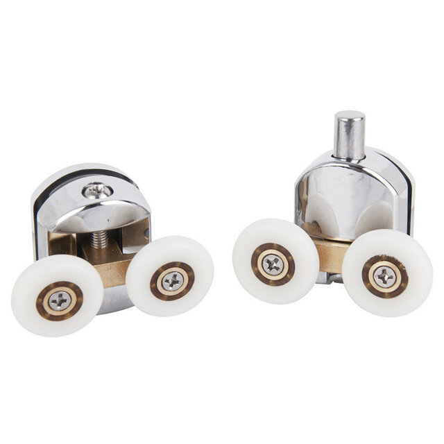 Комплект роликов для раздвижных дверей душевой кабины или ограждения. Подходят для стекол толщиной 4 мм. Комплект из 4 штук (2 верхних и 2 нижних ролика). Верхние ролики двойные, нижние - одинарные. Колесики диаметром 23 мм снабжены подшипниками для более мягкого хода. Легко устанавливаются: верхние при помощи отвертки, нижние фиксируются кнопкой.