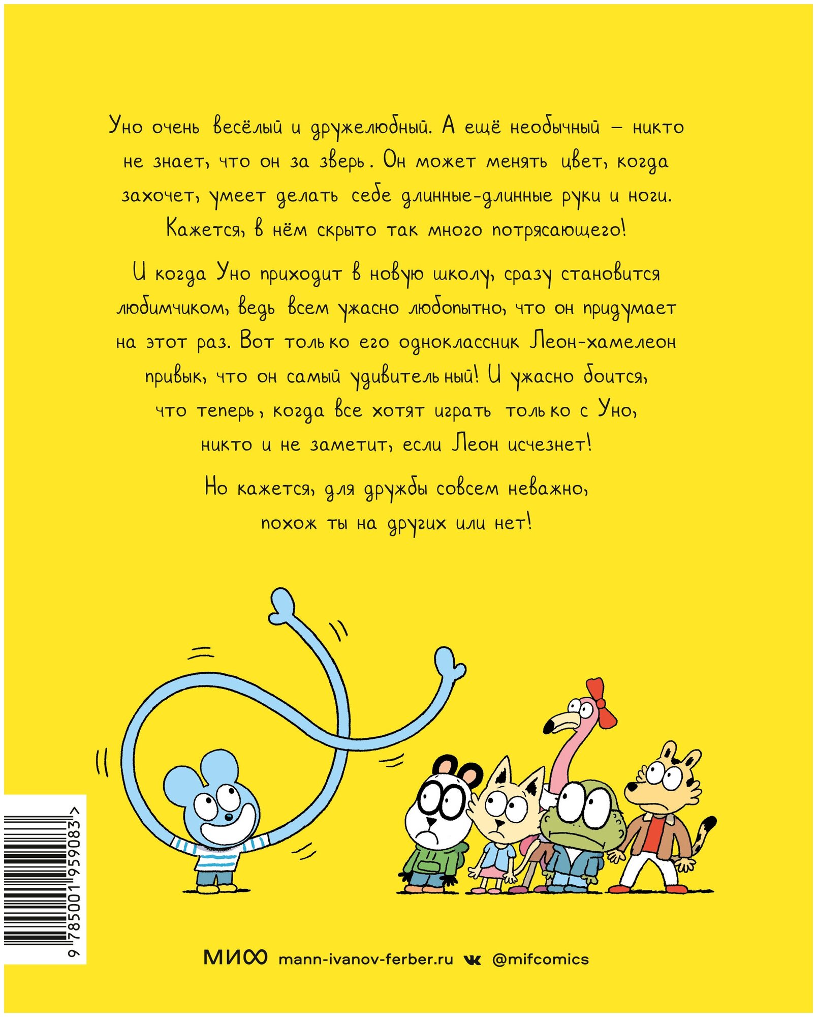 В классе Уно полно разных зверей: медвежонок, мышь, крокодил, хамелеон... И только Уно какой-то странный, ведь он ни на кого не похож. А еще - вытворяет такое! Меняет свой цвет, когда захочет, или вдруг становится счастливым обладателем длинных-длинных рук и ног. Может быть, марсианин? Никто не знает!