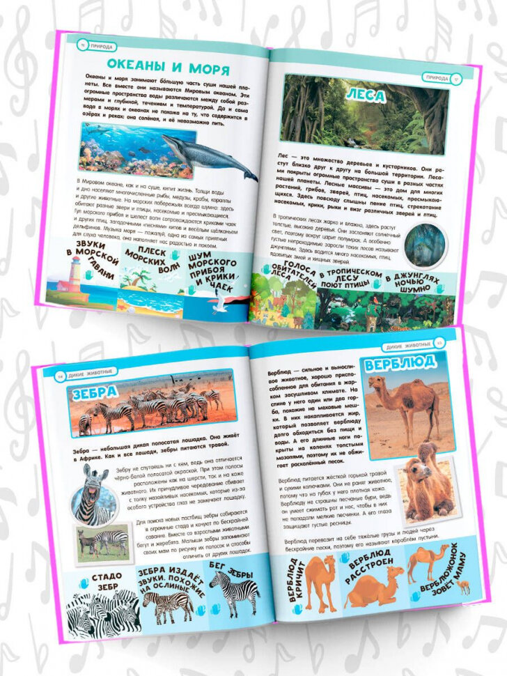 Эта уникальная энциклопедия содержит десятки кратких, но очень интересных статей в сопровождении сотен красочных иллюстраций. В книге собраны сведения буквально обо всём на свете: о природе и животных, о машинах и бытовой технике, о музыке и спорте, об игрушках и детских забавах. А главное - на страницах данной энциклопедии "поселилось" более 500 разнообразных звуков, которые помогут ребёнку услышать и понять, что хочет рассказать нам окружающий мир. Это подлинные звуки птиц, зверей, насекомых, рептилий, земноводных, домашних животных, всевозможных приборов и устройств, музыкальных инструментов и даже различных явлений природы. В конце каждого раздела книги юных почемучек ждут увлекательные игровые задания, развивающие фантазию, воображение и, что важно, способность слышать, запоминать и различать не только голоса живых существ, но и множество других звуков, порой весьма неожиданных, ведь даже в самой пронзительной тишине всегда слышны шорохи, шёпот, шелест.