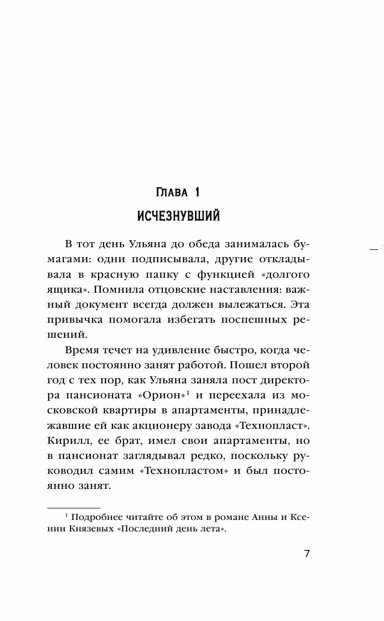 Захватывающий детектив из цикла "Ульяна Железняк. Тени прошлого" ("Последний день лета", "Лето не вечно"). Хорошо закрученная интрига, достоверные персонажи. Начинается история ранним утром, когда в кабинет Ульяны вошел архитектор Зарайский, который держал в руках тубус и картонную папку с эскизами. Но работу по дальнейшей реставрации зданий комплекса пришлось прервать, поскольку из пансионата исчез человек. Его поиски приведут к раскрытию тайны старого клада. Как всегда у Князевой (а теперь и у Анны и Ксении Князевых), будет не только основное расследование, но и экскурс в прошлое (загадка клада, спрятанного в старинной усадьбе, и карты, зашифрованной в печных изразцах), и жадность не только преступников, но и людей от науки, и интриги чиновников... Понравились и следователь Богданов , и Ульяна - женщина сильная, со сложным характером, но умеющая сопереживать. Читается книга легко, с большим интересом. С нетерпением жду следующую историю от Князевых.