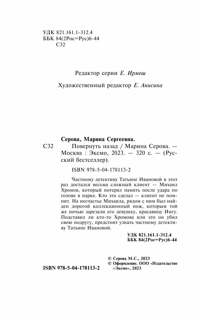Книга: Повернуть назад (Серова Марина Сергеевна); ООО "Издательство "Эксмо", 2023