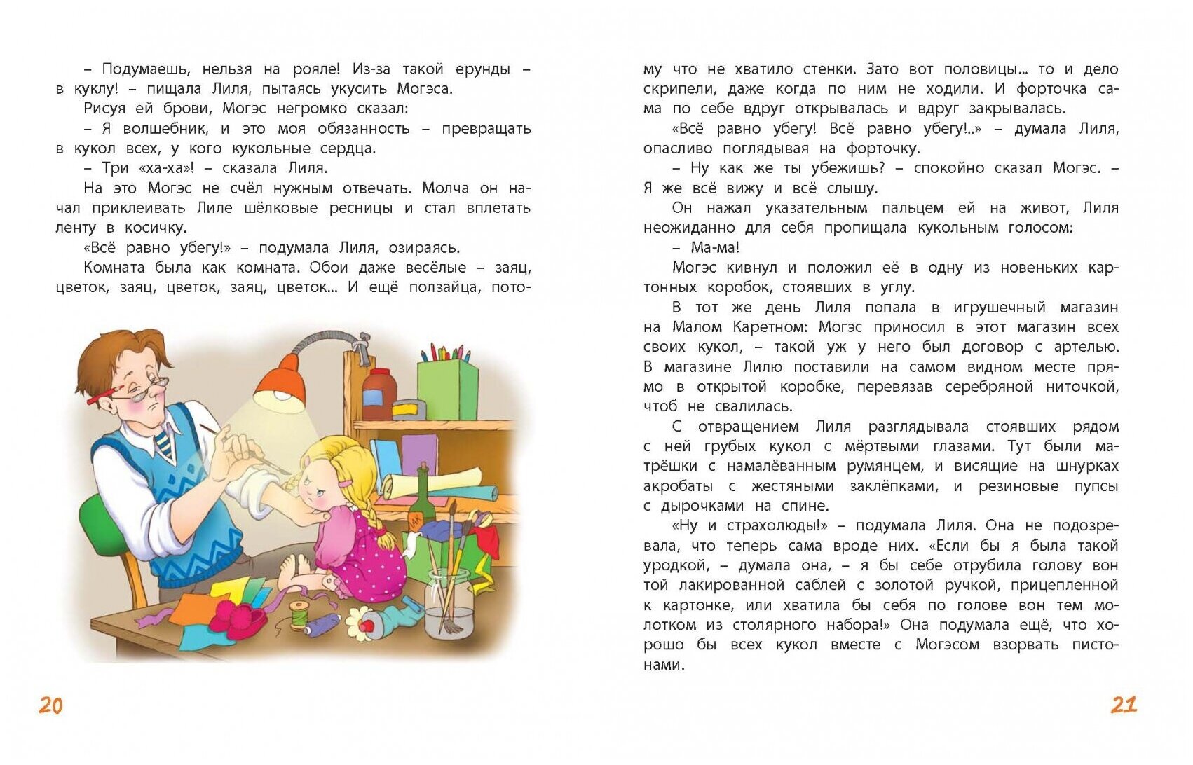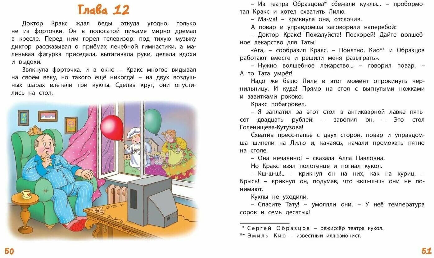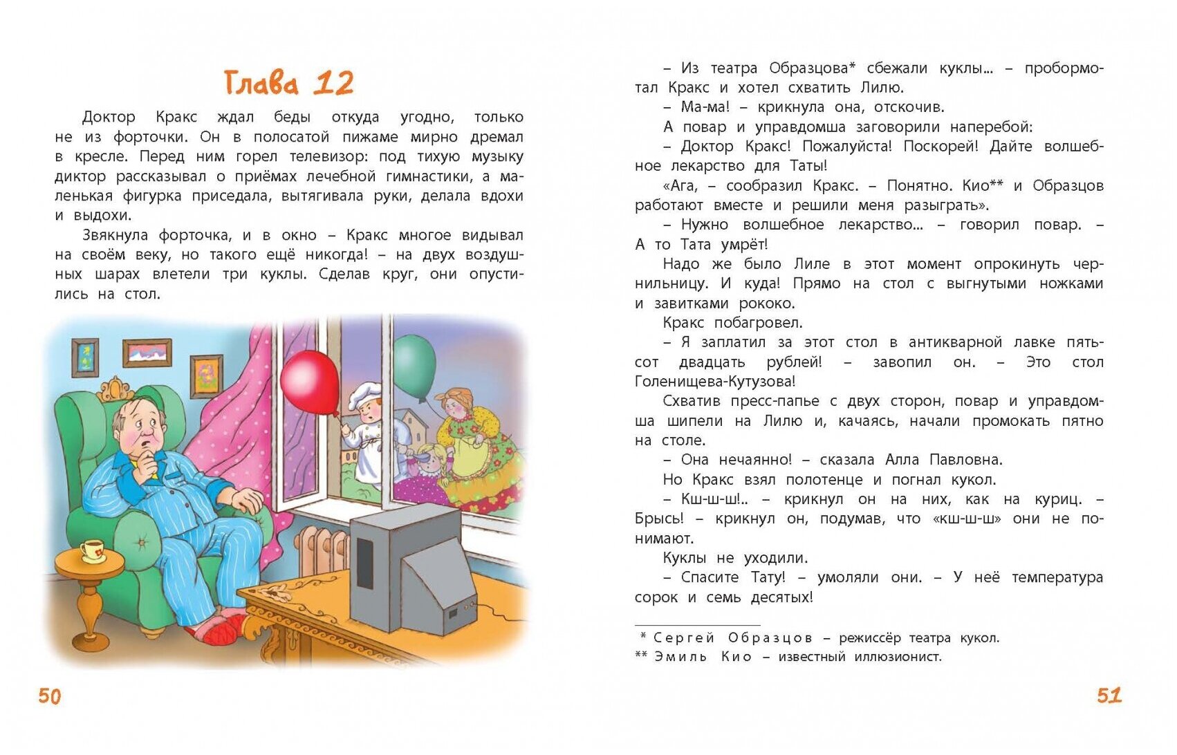 Люди, куклы, волшебники, таинственные врачи, домоуправы, продавцы кукол, московские улицы и переулки – все смешалось в этой сказочной повести в головокружительный водоворот событий. Так что, несмотря на то, что дело закручено вокруг кукол, интересно будет не только девочкам, но и мальчикам.