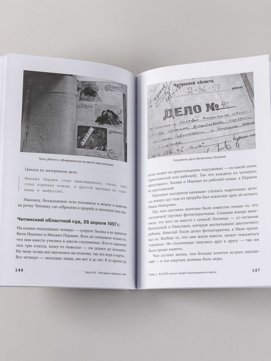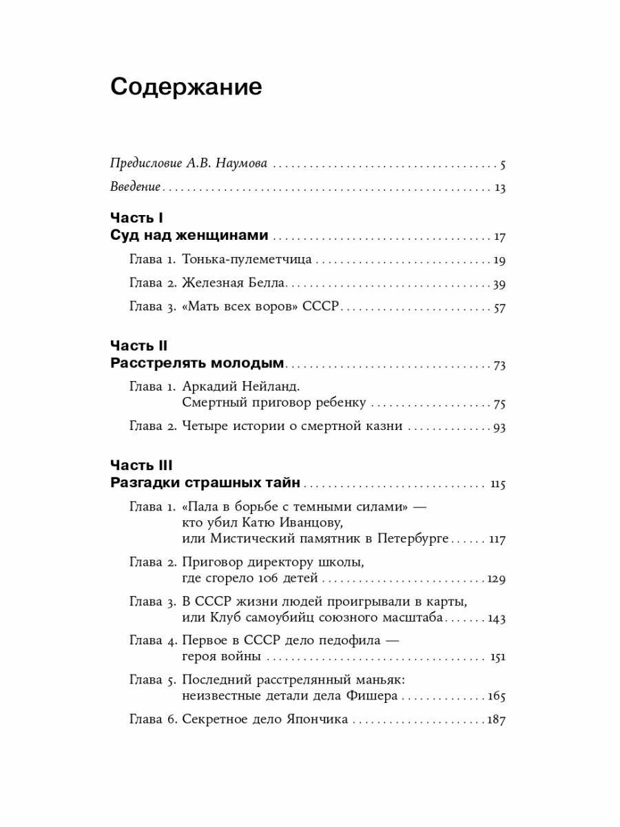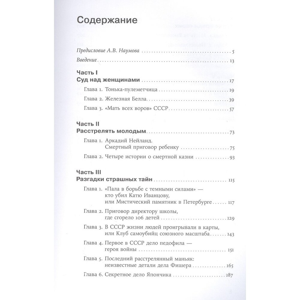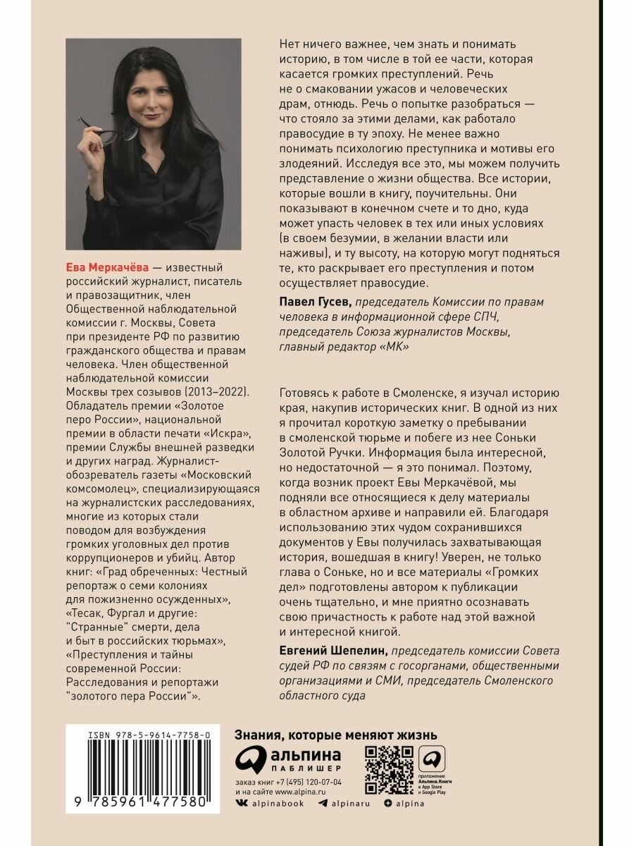 Книга о самых громких уголовных делах советской эпохи. Многие материалы ранее не публиковались и были впервые выданы из архивов лично автору. Благодаря доступу к этим документам и общению с очевидцами Еве Меркачёвой удалось восстановить картины судебных процессов над последним казненным в СССР — маньяком Фишером, над единственным расстрелянным в советское время ребенком Аркадием Нейландом, над палачом Антониной Макаровой по прозвищу Тонька-пулеметчица, над Бертой Бородкиной, накрывавшей столы самому Леониду Брежневу — единственной приговоренной к высшей мере по экономической статье. Перекинуть мостик в прошлое не только интересно и познавательно, но и полезно для осознания тех процессов, что происходят в судебной практике сегодня. К каждой главе прилагаются архивные иллюстрации из уголовных дел и материалов судов — они дают читателю возможность погрузиться в атмосферу описываемых событий и своими глазами увидеть подлинные протоколы допросов, рукописные приговоры, справки об исполнении смертной казни и то, как выглядели тома дел, жертвы, преступники и места преступлений. Завершает книгу единственное досоветское дело «царицы воровского мира» Соньки Золотой Ручки, с которого начался интерес автора к теме судебных расследований.