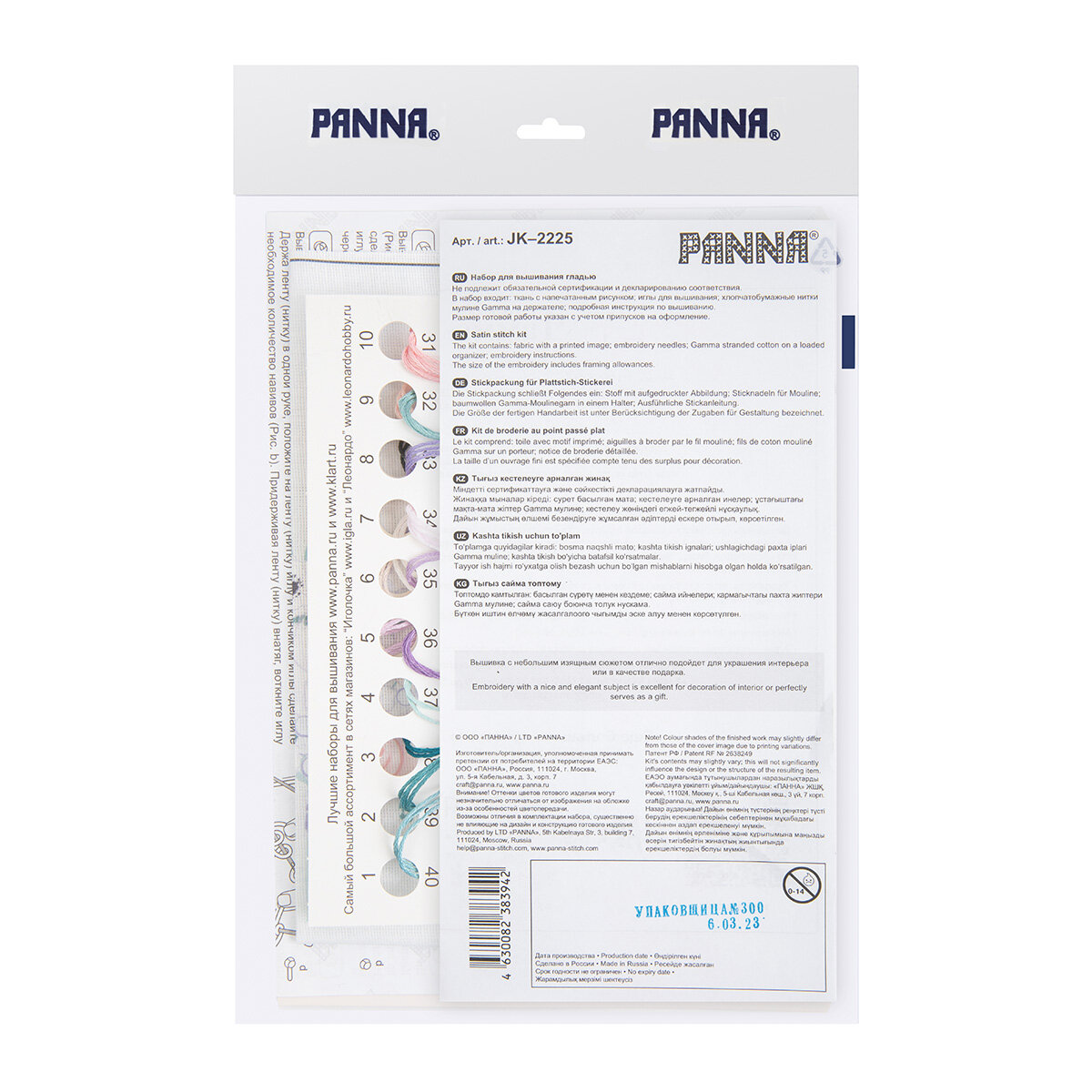 В набор для вышивания "PANNA" входит все необходимое: - подробная инструкция по вышиванию; - иллюстрации к инструкции; - хлопковая ткань с напечатанным рисунком; - х/б нитки мулине "Gamma"; - иглы для вышивания "Gamma". Вышивка с небольшим изящным сюжетом отлично подойдет для украшения интерьера или в качестве подарка.