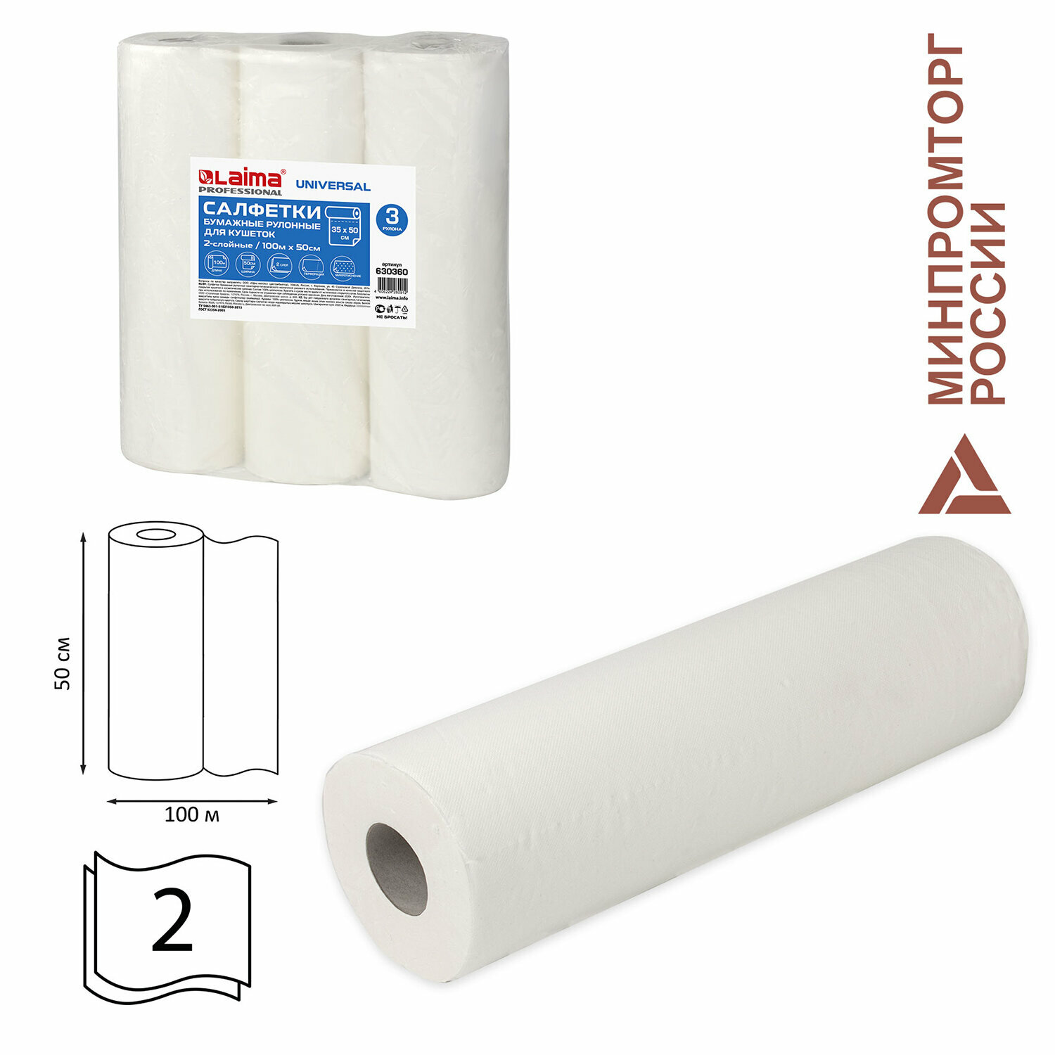 Простыни бумажные рулонные с перфорацией LAIMA UNIVERSAL КОМПЛЕКТ 3 шт. 2-слойные 05х100 м 17+17 г/м2 630360 БС-2-ПР/100