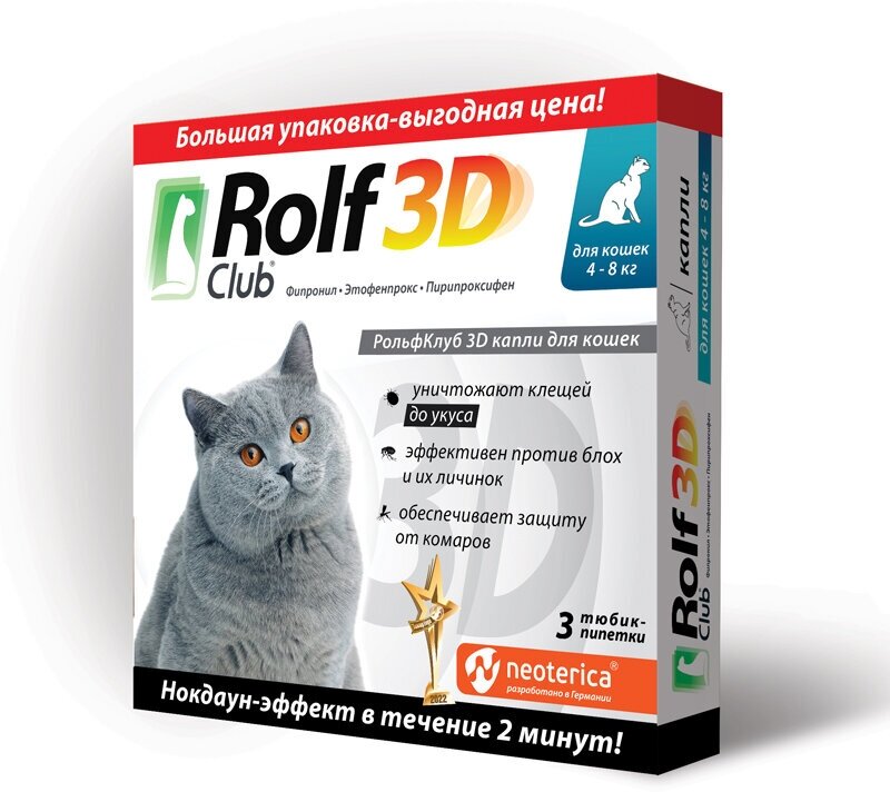 Rolf Club Капли на холку для кошек весом от 4 кг до 8 кг от блох и клещей 3 пипетки