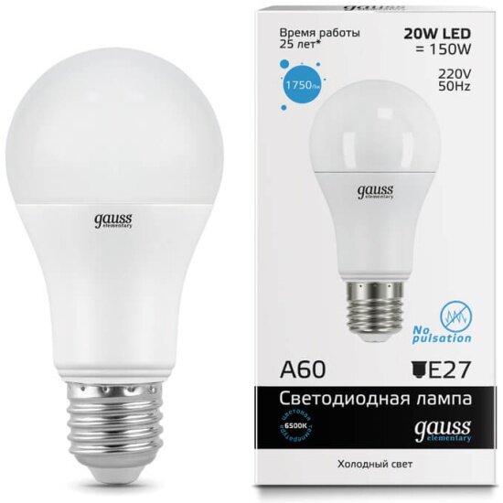 Лампа светодиодная Gauss Elementary 20Вт цок.:E27 кол.:A60 (упак.:10шт)