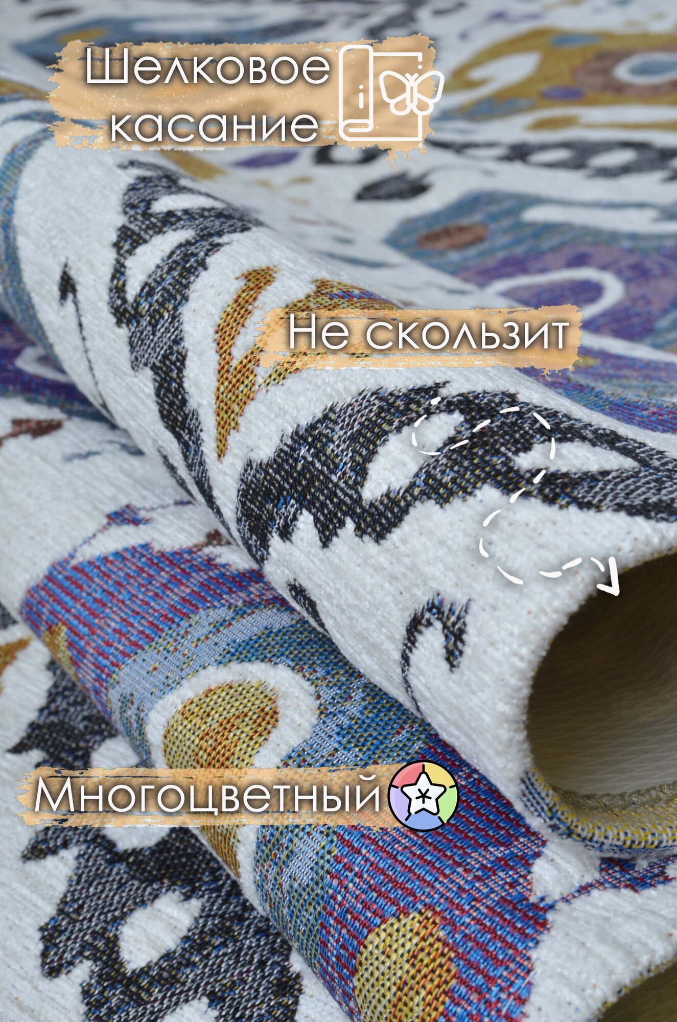 Тканый ковер АРТ3 гобеленового плетения из высококачественных современных материалов (49% полиэстер, 28% акриловый шенилл, 23% хлопок) на противоскользящей основе из латекса. Плотность +- 1100 г кв. м, в основе 6 нитей, уток - 3 нити. Оригинальный дизайн дополнит или обновит Вашу гостиную или спальню. В связи с технологическими особенностями производства, рисунок может пропорционально изменяться в зависимости от размера изделия, не влияя на общий внешний вид. Товар сертифицирован по стандарту OEKO-TEX "Доверие текстилю".Назначение: гостиная, спальня, столовая, кухня, детская, ковер в дом, ковер в комнату.
