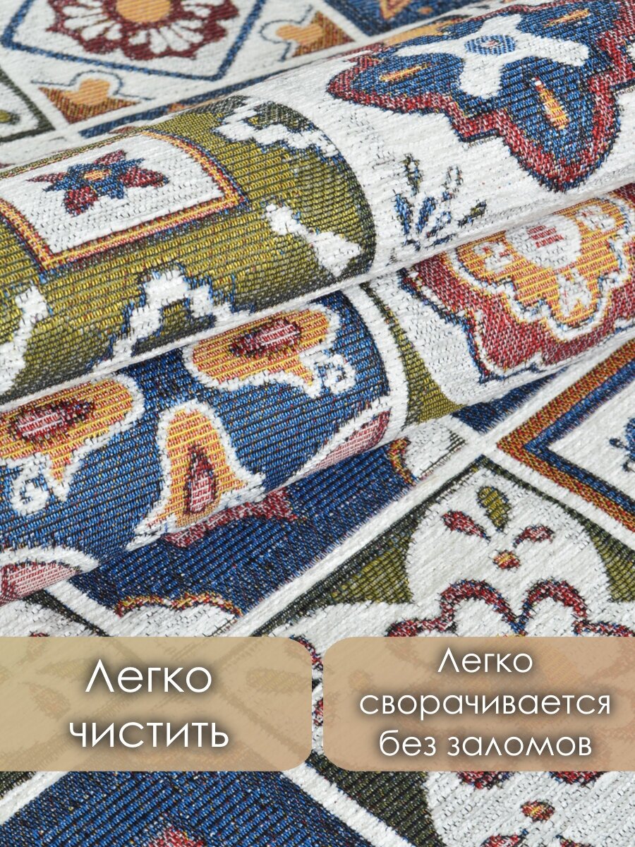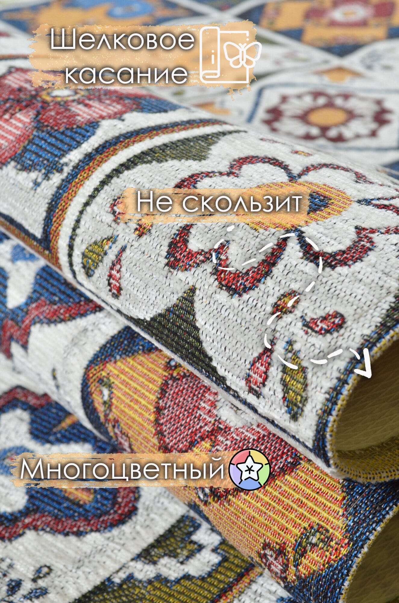 Тканый ковер гобеленового плетения из высококачественных современных материалов (49% полиэстер, 28% акриловый шенилл, 23% хлопок) на противоскользящей основе из латекса. Плотность +/- 1100 г / кв.м., в основе 6 нитей, уток – 3 нити. Оригинальный дизайн дополнит или обновит Вашу гостиную или спальню.В связи с технологическими особенностями производства, рисунок может пропорционально изменяться в зависимости от размера изделия, не влияя на общий внешний вид. Товар сертифицирован по стандарту OEKO-TEX «Доверие текстилю».