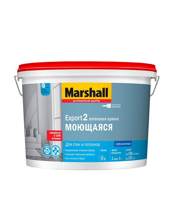 Латексная интерьерная краска Marshall Export-2 на водной основе предназначена для отделки потолков и стен внутри помещений. Материал профессионального качества наносится валиком, кистью или распылителем без брызг и потеков, образует долговечное гладкое матовое покрытие. База BC колеруется в насыщенные и глубокие оттенки.ПреимуществаЛатексная краска с высокой адгезией защищает обрабатываемую поверхность от неблагоприятных внешних воздействий и продлевает срок ее службы.Материал экономно расходуется за счет отличной укрывистости.Водно-дисперсионный состав быстро сохнет.Покрытие устойчиво к влажной уборке без моющих средств.Краска без резкого запаха допущена для использования в медицинских и детских учреждениях.Область примененияMarshall Export-2 рекомендуется использовать для окрашивания потолков и стен в гостиной, детской, спальне, гардеробной, кабинете и других комнатах с умеренной влажностью. Водно-дисперсионный состав наносится в два слоя на обои под покраску, гипсокартон, хорошо просохшие оштукатуренные, кирпичные, бетонные и прочие минеральные основания.Краски Marshall производит российский завод концерна AkzoNobel - признанного лидера мирового рынка лакокрасочных материалов. Современная и практичная продукция соответствует международным стандартам качества.
