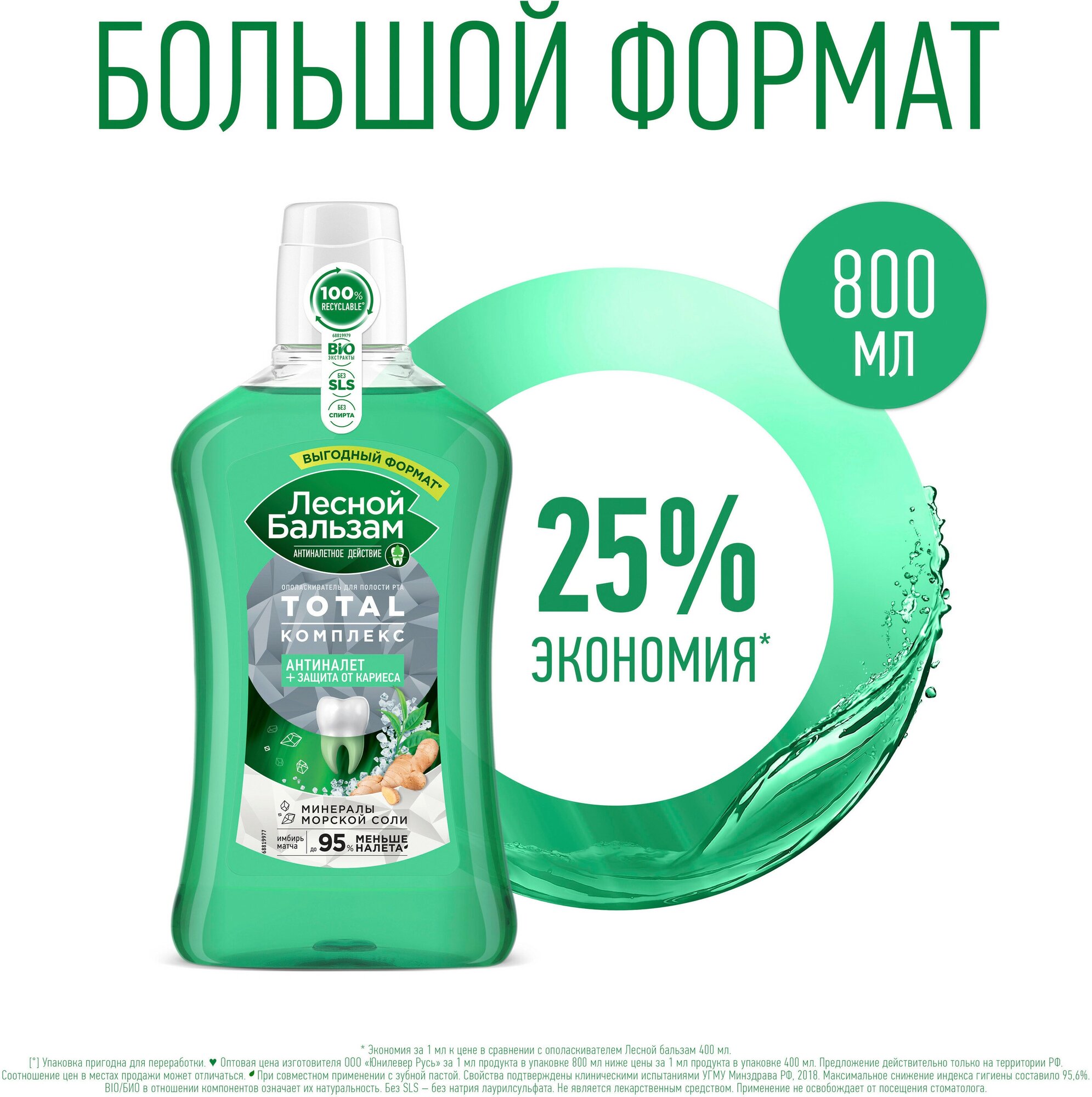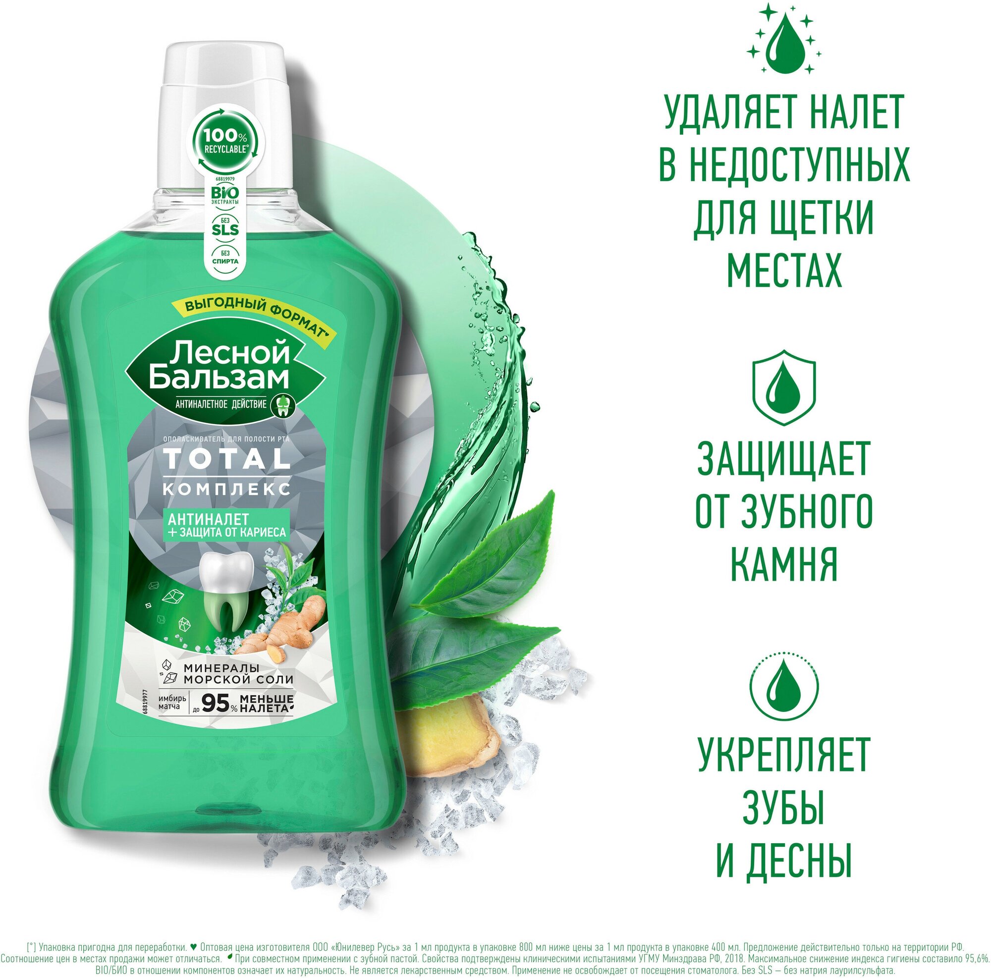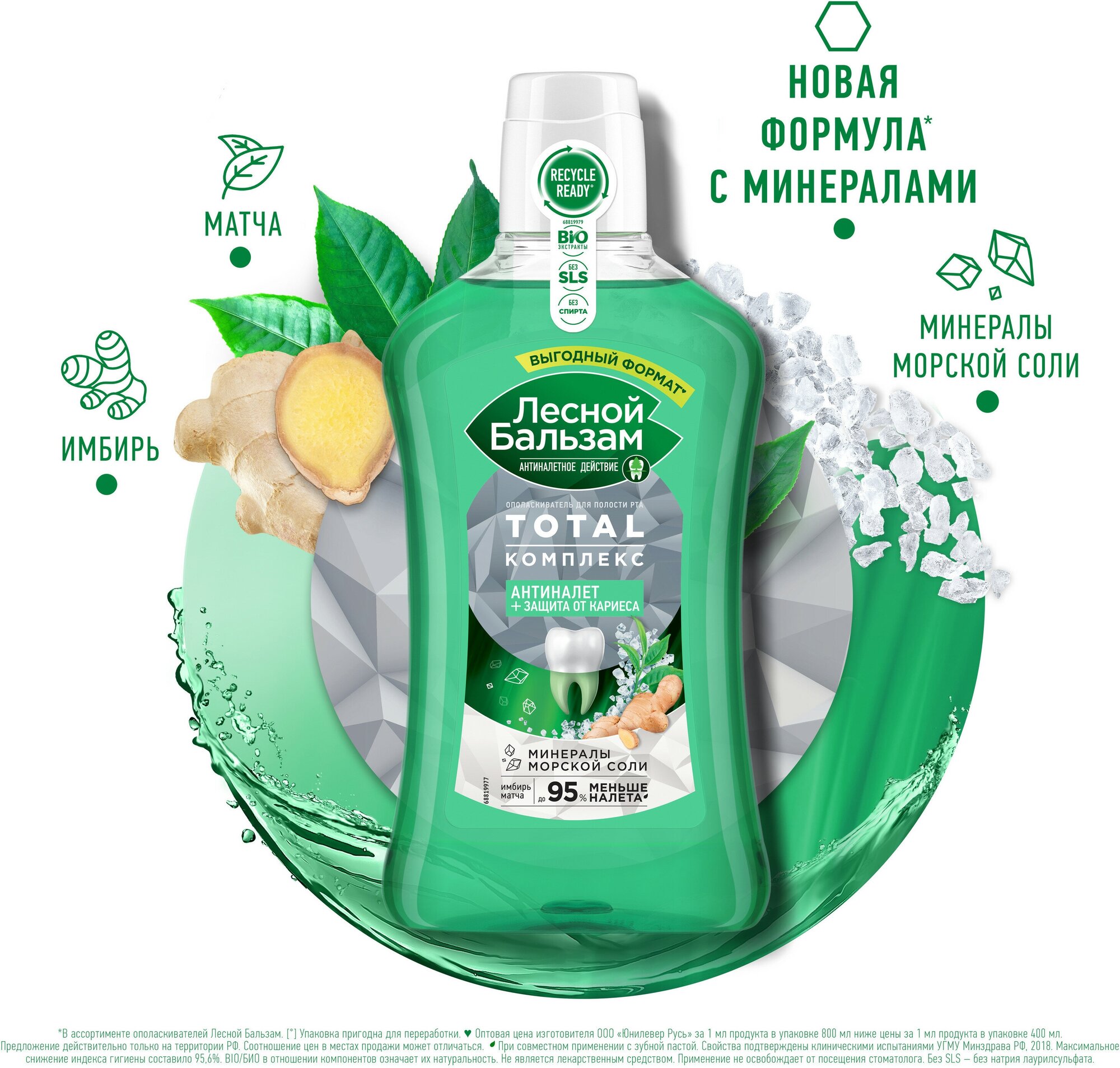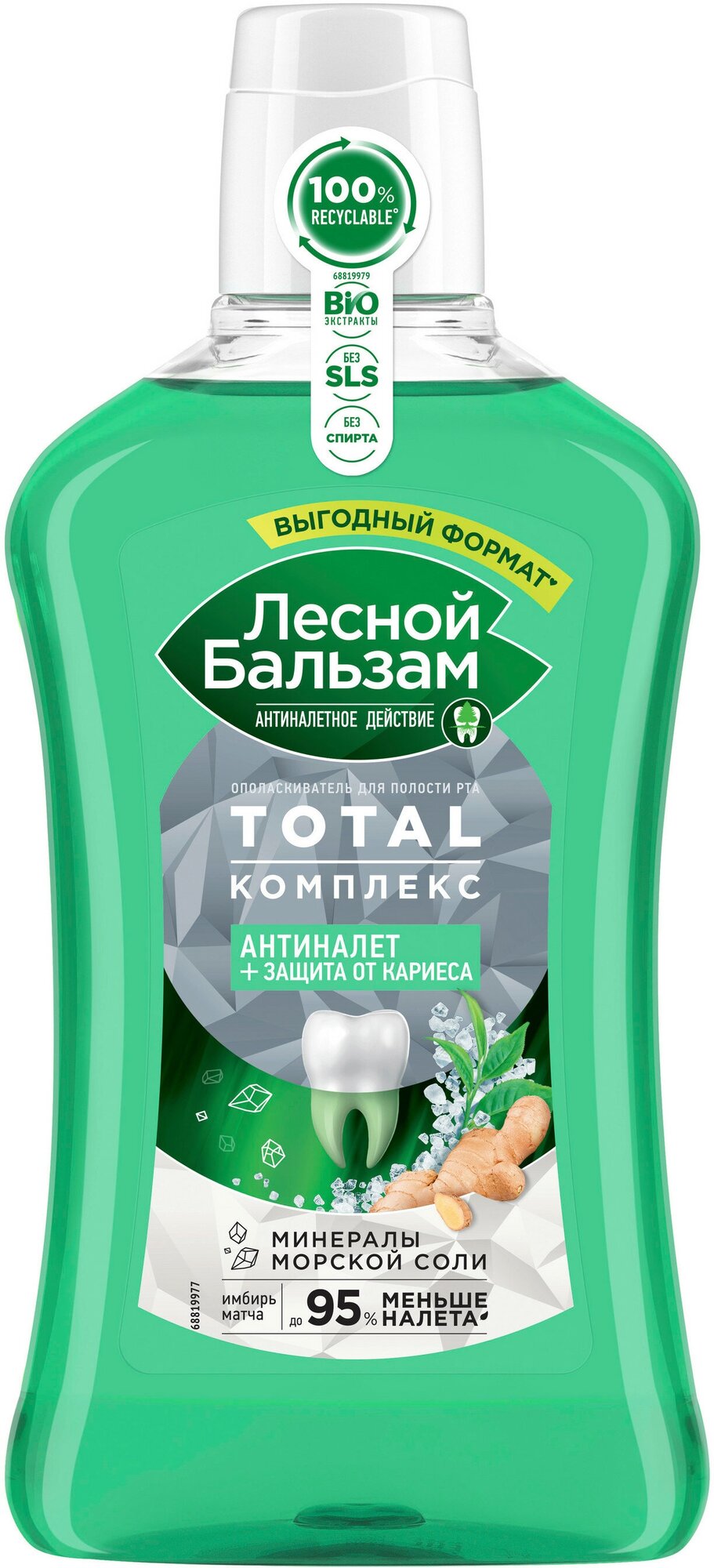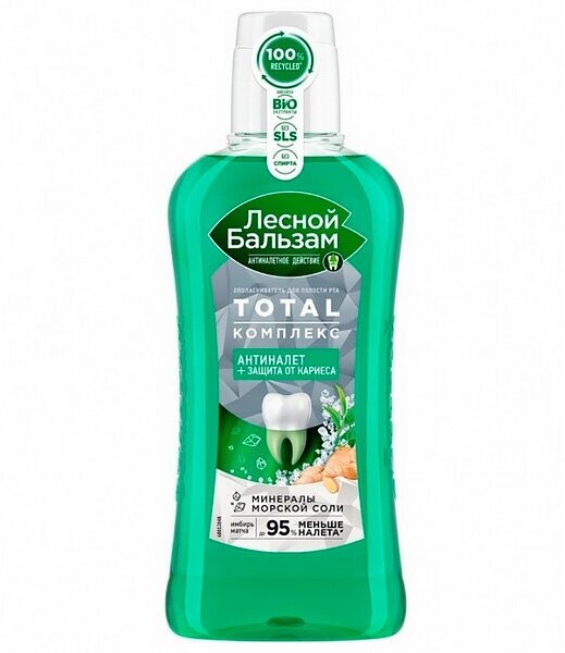 Лесной бальзам TOTAL Комплекс с морской солью, экстрактом имбиря и чаем матча, в составе которого 98% ингредиентов натурального происхождения. Ополаскиватель TOTAL Комплекс борется с первопричиной развития серьезных проблем полости рта зубным налетом, который вызывает кариес, влияет на изменение цвета зубов, приводит к образованию зубного камня и кровоточивости десен.Формула ополаскивателя усилена минеральными компонентами и экстрактами трав, не содержит парабенов, SLS и спирта и рекомендована стоматологами для ежедневного использования: морская соль помогает предотвратить разрушающее действие налета на эмаль зубов; экстракт имбиря и чай матча укрепляют десны, защищая их от воспаления и кровоточивости. Используй ополаскиватель Лесной бальзам TOTAL Комплекс после каждой чистки зубов и избавься от налета в два счета! Он поможет значимо улучшить домашнюю гигиену полости рта, а именно1: качественно очищать межзубные промежутки; сохранять ощущение чистых зубов за счет снижения скорости повторного образования налета на зубах; препятствовать образованию зубного камня; заботиться об укреплении десен и зубов. Клинически доказано: до 95% меньше налета. Ополаскиватель Лесной бальзам TOTAL Комплекс также рекомендован для усиления гигиены полости рта при ношении брекетов или съемных зубных протезов. Он обеспечивает дополнительную защиту от развития кариесогенной микрофлоры, сокращает размножение патогенных бактерий в полости рта, защищает от развития локального воспаления1.Флакон ополаскивателя на 100% сделан из переработанного пластика. Упаковка пригодна для переработки.