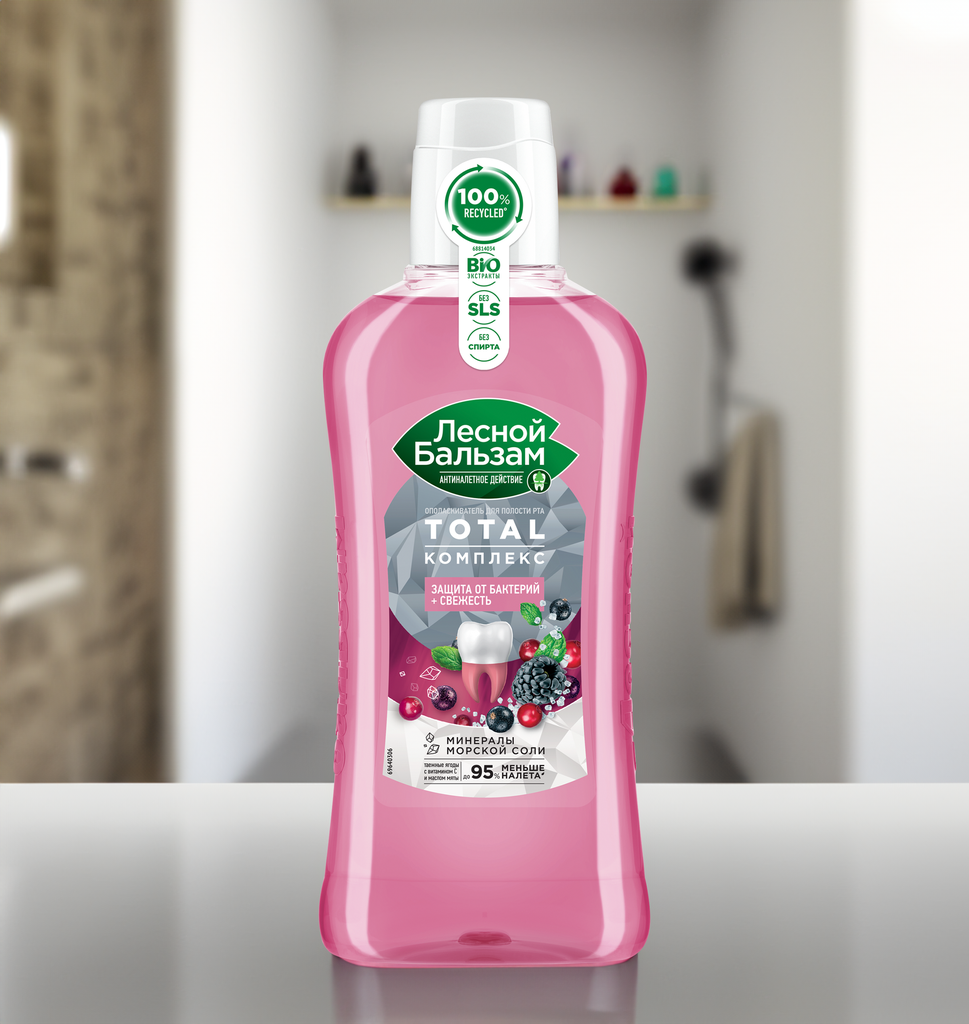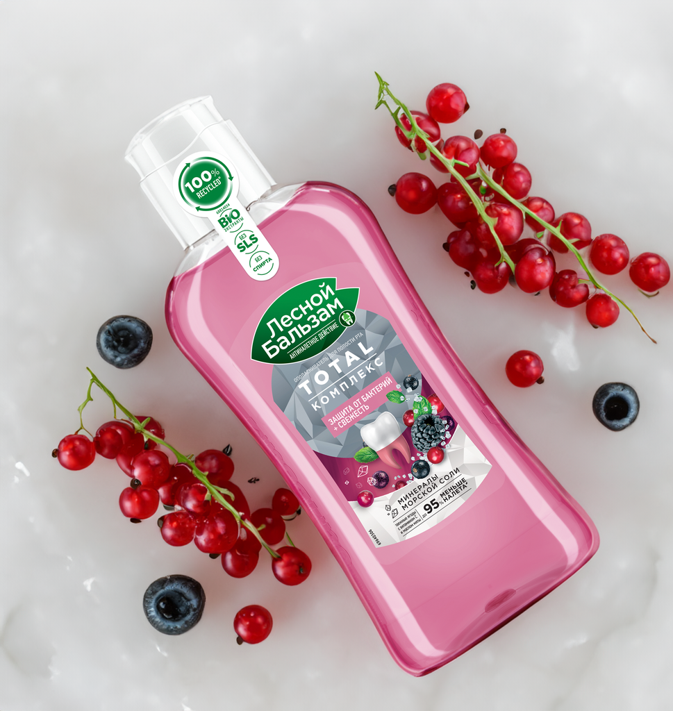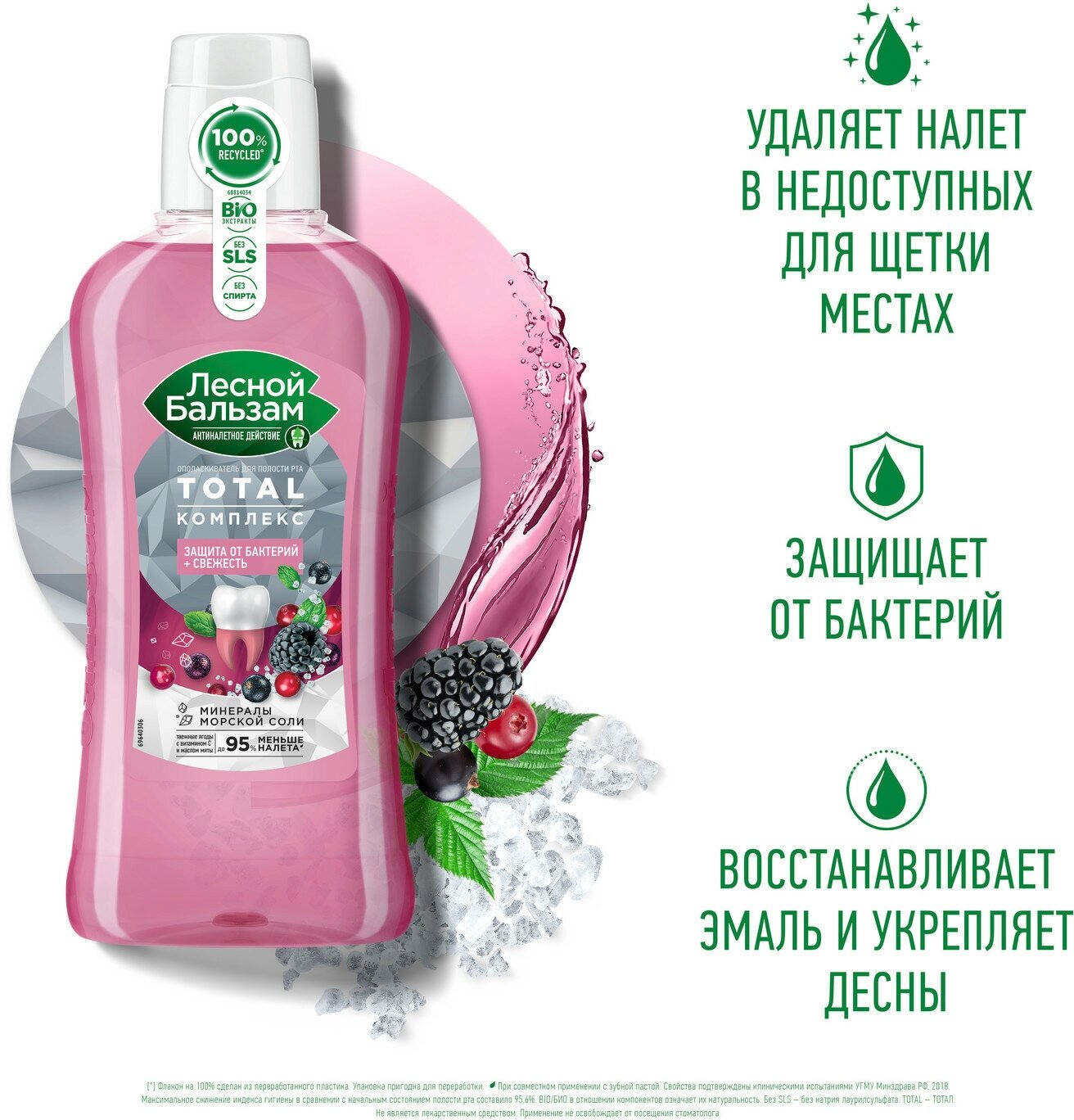 Добавь в свой ежедневный уход за полостью рта новый ополаскиватель для комплексной защиты зубов и десен Лесной бальзам TOTAL Комплекс с экстрактами таежных ягод, витамином С и маслом мяты, в составе которого 98% ингредиентов натурального происхождения. Ополаскиватель для полости рта TOTAL Комплекс борется с первопричиной развития серьезных проблем полости рта зубным налетом, который вызывает кариес и изменение цвета зубов, приводит к появлению зубного камня и кровоточивости десен. Формула ополаскивателя с таежными ягодами, витамином С и маслом мяты не содержит парабенов, SLS и спирта и рекомендована стоматологами для ежедневного использования: удаляет налет даже в межзубных промежутках; помогает предотвратить разрушающее действие налета на зубы и десны; восстанавливает эмаль и укрепляет десны, снижая риск развития серьезных проблем полости рта. Используй ополаскиватель Лесной бальзам TOTAL Комплекс после каждой чистки зубов и избавься от налета в два счета! Он помогает значимо улучшить домашнюю гигиену полости рта, а именно: качественно очищает межзубные промежутки; сохраняет ощущение чистых зубов за счет снижения скорости повторного образования налета; препятствует образованию зубного камня; заботится об укреплении десен и зубов. Клинически доказано: до 95% меньше налета. Ополаскиватель Лесной бальзам TOTAL Комплекс также подходит для гигиены полости рта при ношении брекетов или съемных зубных протезов. Он снижает скорость размножения кариесогенной микрофлоры и защищает от развития локального воспаления1.