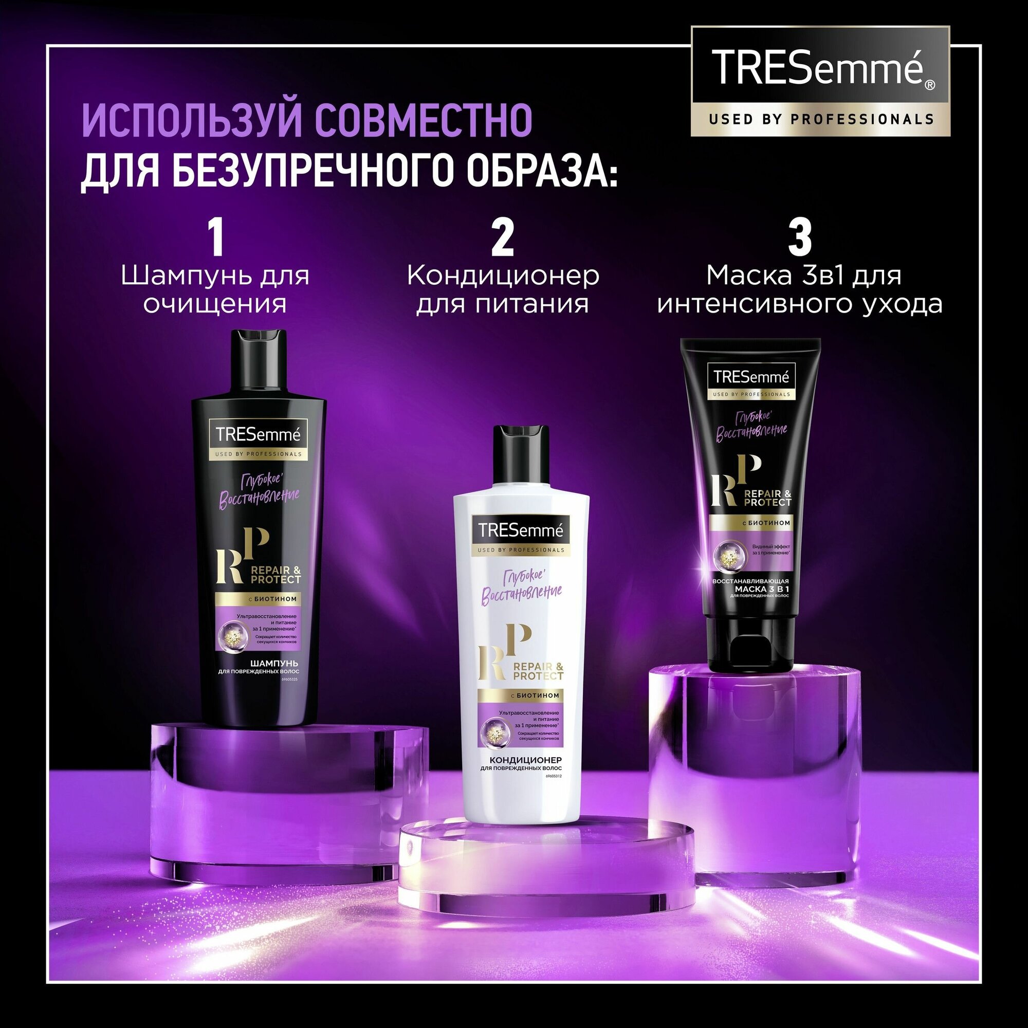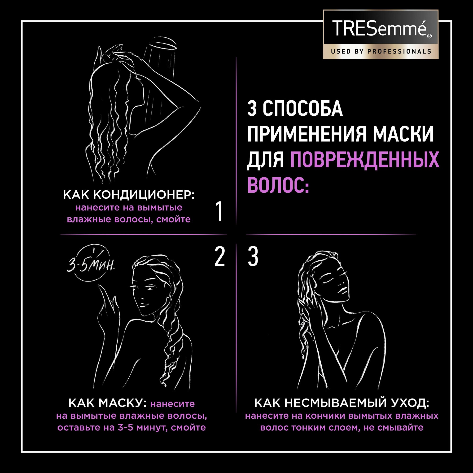 Позаботься о красоте волос с новинкой от TRESemm восстанавливающей маской Repair & Protect от бренда. Скорая SOS-помощь для безжизненных волос еще эффективнее с новой маской TRESemm из серии Repair & Protect! Формула с биотином работает с каждым волосом, восстанавливая его изнутри; Значительно сокращает ломкость волос; Сохраняет свежесть и подвижность волос. Попробуй все три способа применения маски. Как кондиционер: нанеси на вымытые влажные волосы, смой. В качестве маски: нанеси на вымытые влажные волосы, оставь на 3-5 минут, смой. И как несмываемый уход: нанеси на кончики вымытых влажных волос тонким слоем, не смывай. Подходит для регулярного использования. Видимый результат уже с первого применения.
