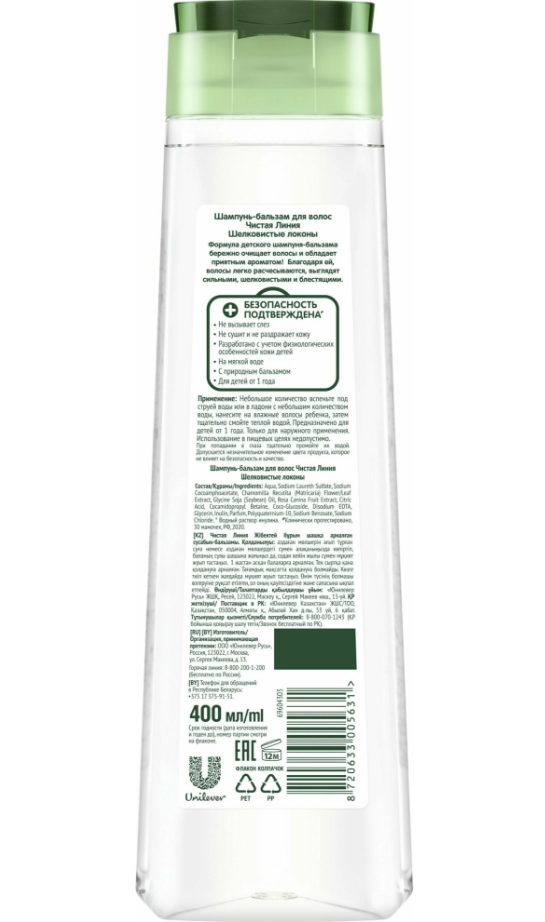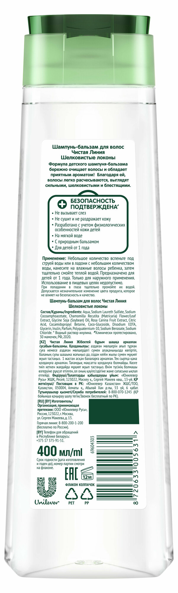 шампунь ЧИСТАЯ ЛИНИЯ Kids 2в1 Шелковистые Локоны 400мл детский