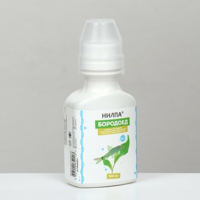«Бородоед» – это эффективное средство для профилактики и борьбы с нежелательными водорослями в аквариуме. Применяется против зеленых и красных водорослей (черная борода, вьетнамка), и прочих.Также применим в качестве источника органического СО2 для ускорения роста аквариумных растений. Действие средства основано на дезинфекции водной среды химическим способом таким образом, что многие виды водорослей постепенно разлагаются и отмирают.Способ применения:Профилактика возникновения водорослей и как источник органического СО2 (без необходимости подачи СО2 из баллона): ежедневно 5-7 мл на 100 л. аквариумной воды. Рекомендуется дополнительное внесение стимуляторов роста аквариумных растений Нилпа® «Микро» и «Макро», согласно инструкции для обеспечения полноценного питания необходимыми элементами.Против водорослевых вспышек и для интенсивной борьбы с нежелательными водорослями: 10-12 мл на 100 литров аквариумной воды в день. Подмену воды во время использования средства «Бородоед», нужно сделать на 3-ий день использования, подменяя 20-30% воды, а затем производить подмену воды раз в неделю.Во время использования средства необходима аэрация воды. Чрезмерная заиленность фильтрующих материалов фильтра снижает эффективность препарата. Период и процесс избавления от нежелательных водорослей у всех может протекать по-разному. В среднем, гибель вредных водорослей происходит в промежутке от 7 до 21 дня после начала внесения препарата. Возможно локальное применение препарата.Для этого рекомендуется отключить фильтрующие устройства на 15-30 минут и с помощью шприца распылить «Бородоед» на очаги возникновения водорослей из расчёта 1 мл. на 5 см2 , но не более 10-12 мл на 100 литров.