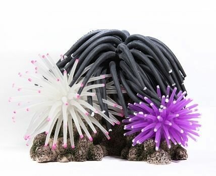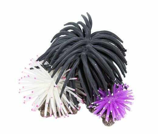 Декорации выполнены из силикона, могут долгое время находиться в воде. Размер аксессуара: 10,5 х 9,5 х 8 см. Цвета кораллов: черный, белый, фиолетовый.
