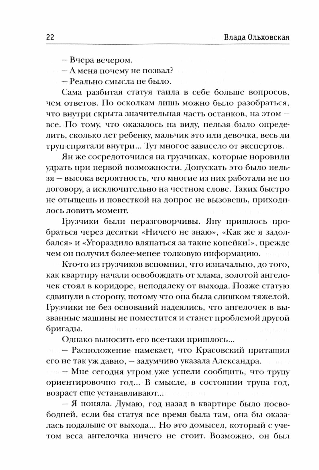 Начало довольно захватывающее: при вывозе залежей мусора из квартиры умершего хордера рабочие случайно роняют огромную уродливую статуэтку ангела. Она разбивается, в ней находят мумифицированные останки ребенка. Ян и Александра начинают расследование. Повествование в хорошем темпе, нигде не провисает, я с интересом дочитала до конца. Дочитала – и вдруг задумалась. И поняла что в написанном логика отсутствует почти начисто, ситуации такие и вообразить себе невозможно. А главное, я с ужасом обнаружил в себе задатки гениального преступника! Потому что за полчаса придумала, как те же преступные цели можно было осуществить в сто раз менее сложным, затратным и извращенным образом.