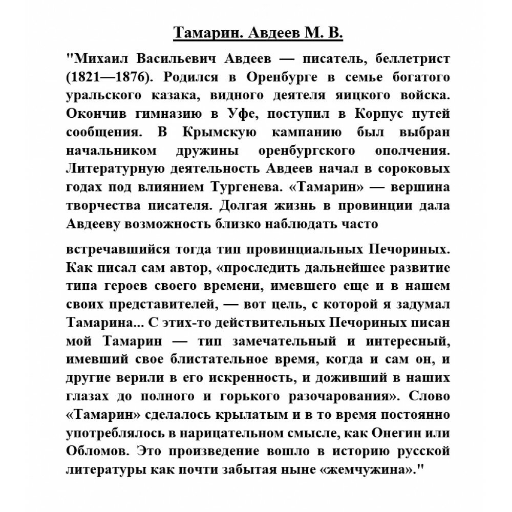 Михаил Васильевич Авдеев - писатель, беллетрист (1821-1876). Родился в Оренбурге в семье богатого уральского казака, видного деятеля яицкого войска. Окончив гимназию в Уфе, поступил в Корпус путей сообщения. В Крымскую кампанию был выбран начальником дружины оренбургского ополчения. Литературную деятельность Авдеев начал в сороковых годах под влиянием Тургенева. "Тамарин" - вершина творчества писателя. Долгая жизнь в провинции дала Авдееву возможность близко наблюдать часто встречавшийся тогда тип провинциальных Печориных. Как писал сам автор, "проследить дальнейшее развитие типа героев своего времени, имевшего еще и в нашем своих представителей, - вот цель, с которой я задумал Тамарина... С этих-то действительных Печориных писан мой Тамарин - тип замечательный и интересный, имевший свое блистательное время, когда и сам он, и другие верили в его искренность, и доживший в наших глазах до полного и горького разочарования". Слово "Тамарин" сделалось крылатым и в то время постоянно употреблялось в нарицательном смысле, как Онегин или Обломов. Это произведение вошло в историю русской литературы как почти забытая ныне "жемчужина".