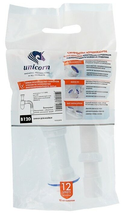 Сифоны и гофры из надежных материалов обеспечат бесперебойный спуск воды в канализацию.Основная функция сантехнического сифона заключается в том, чтобы не было засоров в канализации, и неприятный запах не проникал в жилое помещение. Для этих целей каждый сифон имеет специальное колено ниже верхнего уровня трубы, по которой вода уходит в канализацию. В этом колене останавливаются предметы, случайно попавшие в раковину или ванну, а водяная пробка отсекает неприятный запах из труб. Сифон для мойки "Unicorn" изготовлен по технологии многокомпонентного литья Multi-Injection, которая обеспечивает абсолютную герметичность и полную защиту от протекания. Корпус выполнен из высокопрочного пластика. Система Quick Fit обеспечивает сверхбыструю сборку и установку, а также долговечное использование.
