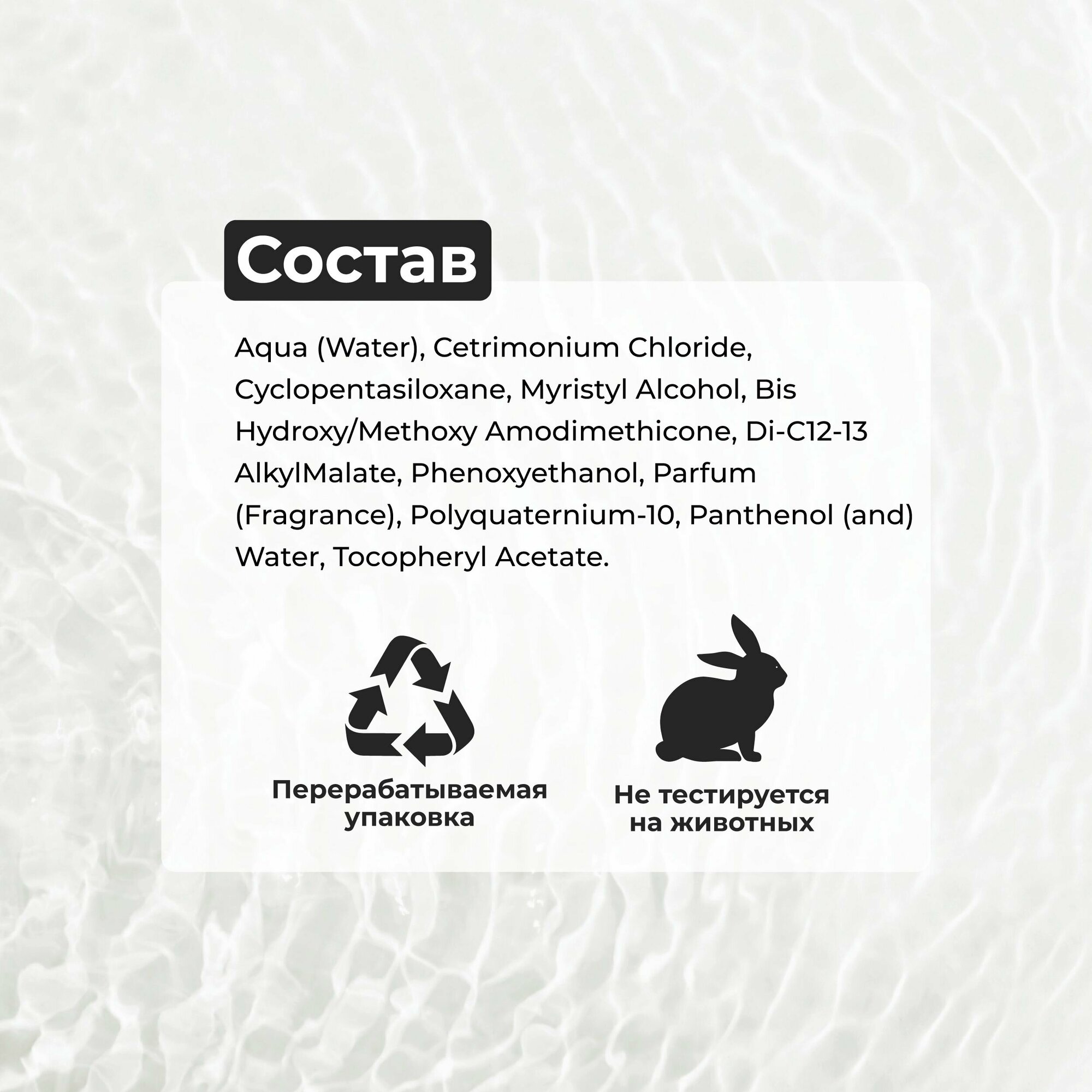 | Состав | Aqua (Water), Cetrimonium Chloride, Cyclopentasiloxane, Myristyl Alcohol, BIS-Hydroxy/Methoxy Amodimethicone, Di-C12-13 Alkyl Malate, Phenoxyethanol, Parfum (Fragrance), Polyquaternium-10, Panthenol (and) Water, Tocopheryl Acetate. |