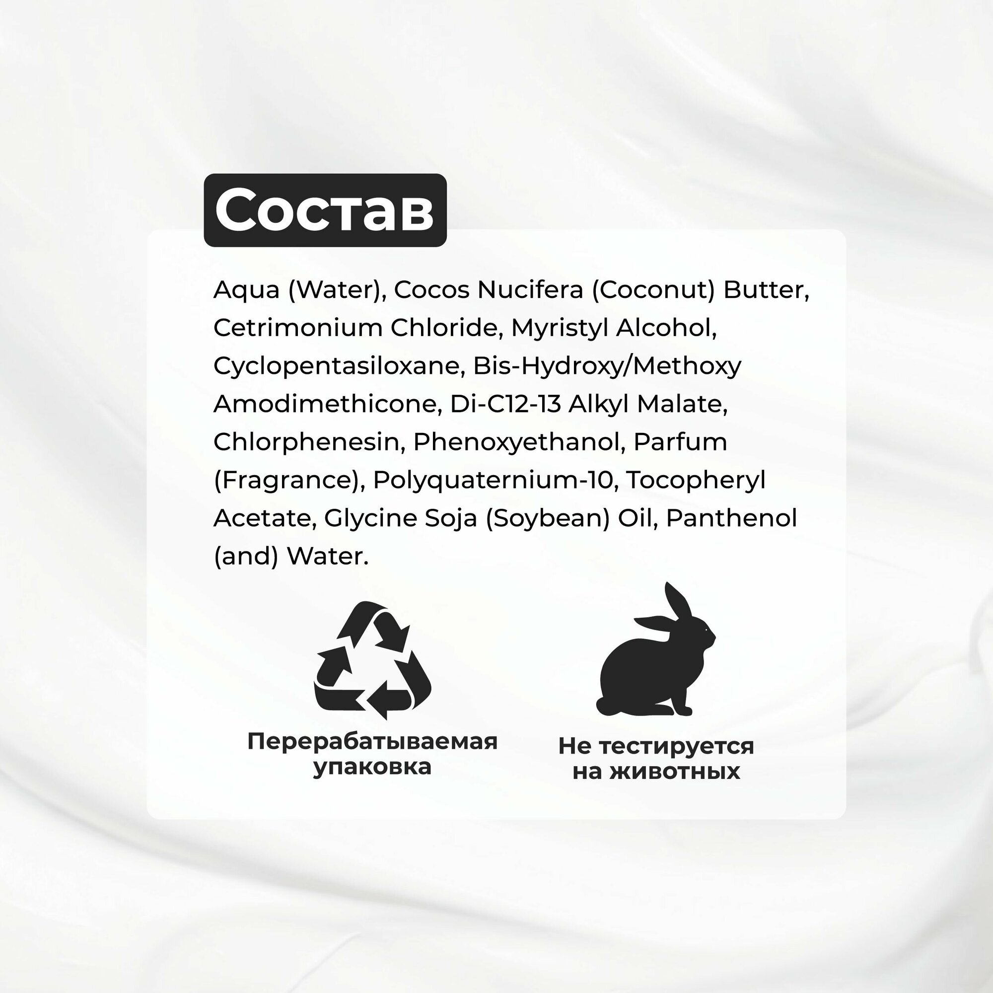 | Состав | Aqua (Water), Cocos Nucifera (Coconut) Butter, Cetrimonium Chloride, Myristyl Alcohol, Cyclopentasiloxane, BIS-Hydroxy/Methoxy Amodimethicone, Di-C12-13 Alkyl Malate, Chlorphenesin, Phenoxyethanol, Parfum (Fragrance), Polyquaternium-10, Tocopheryl Acetate, Glycine Soja (Soybean) Oil, Panthenol (and) Water |