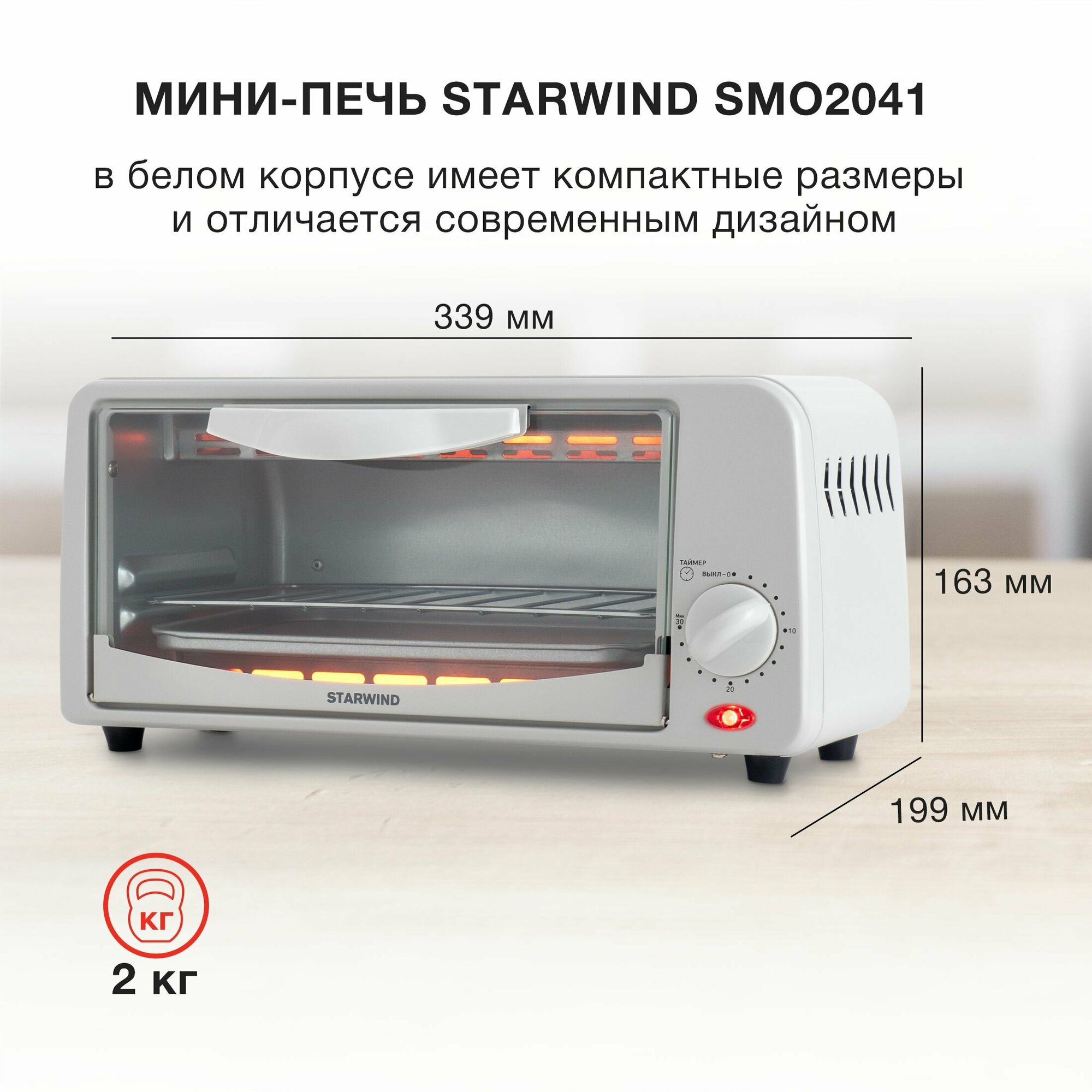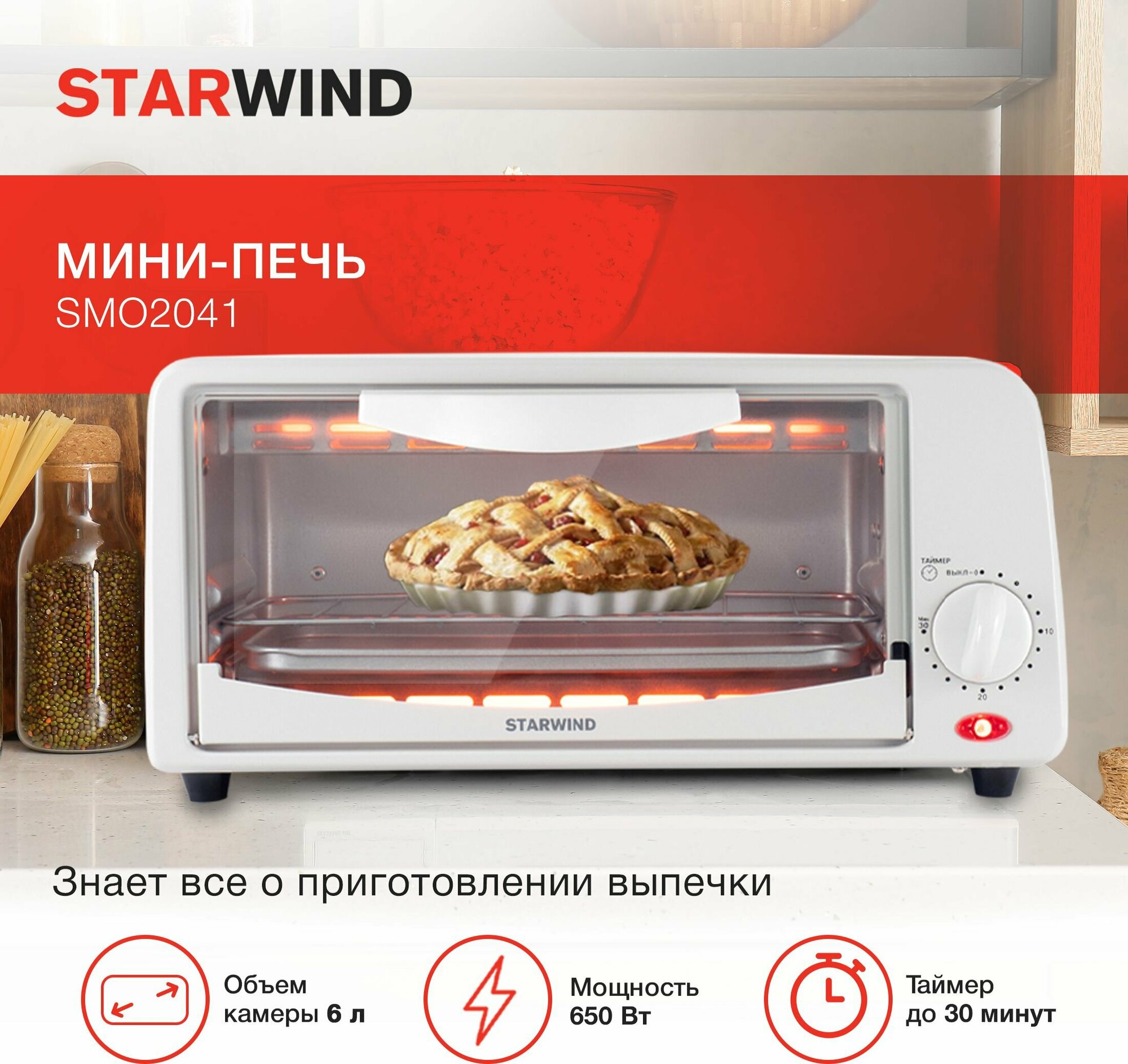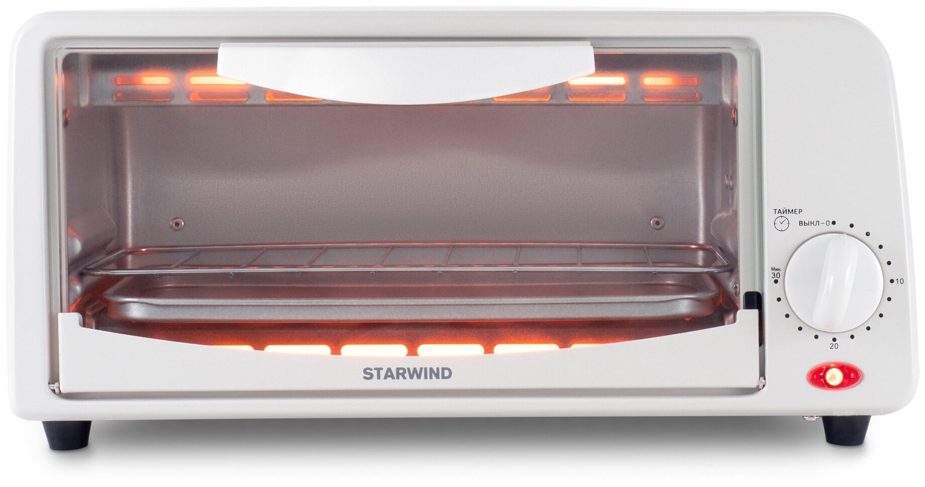 Мини-печь Starwind SMO2041 белый, мощность 650Вт, объем духовки 6л., механическое управление, температура терморегулятора -250 С