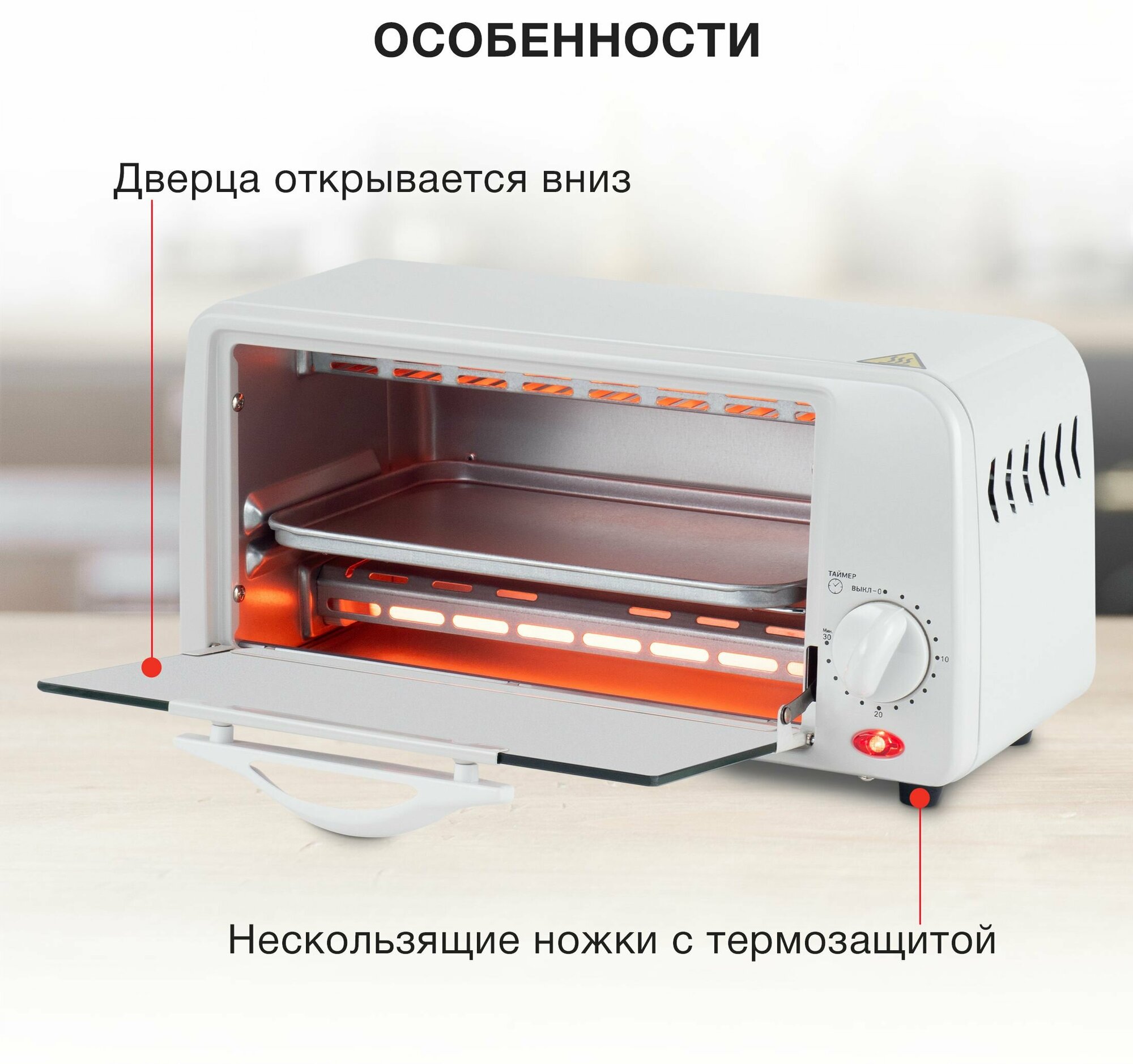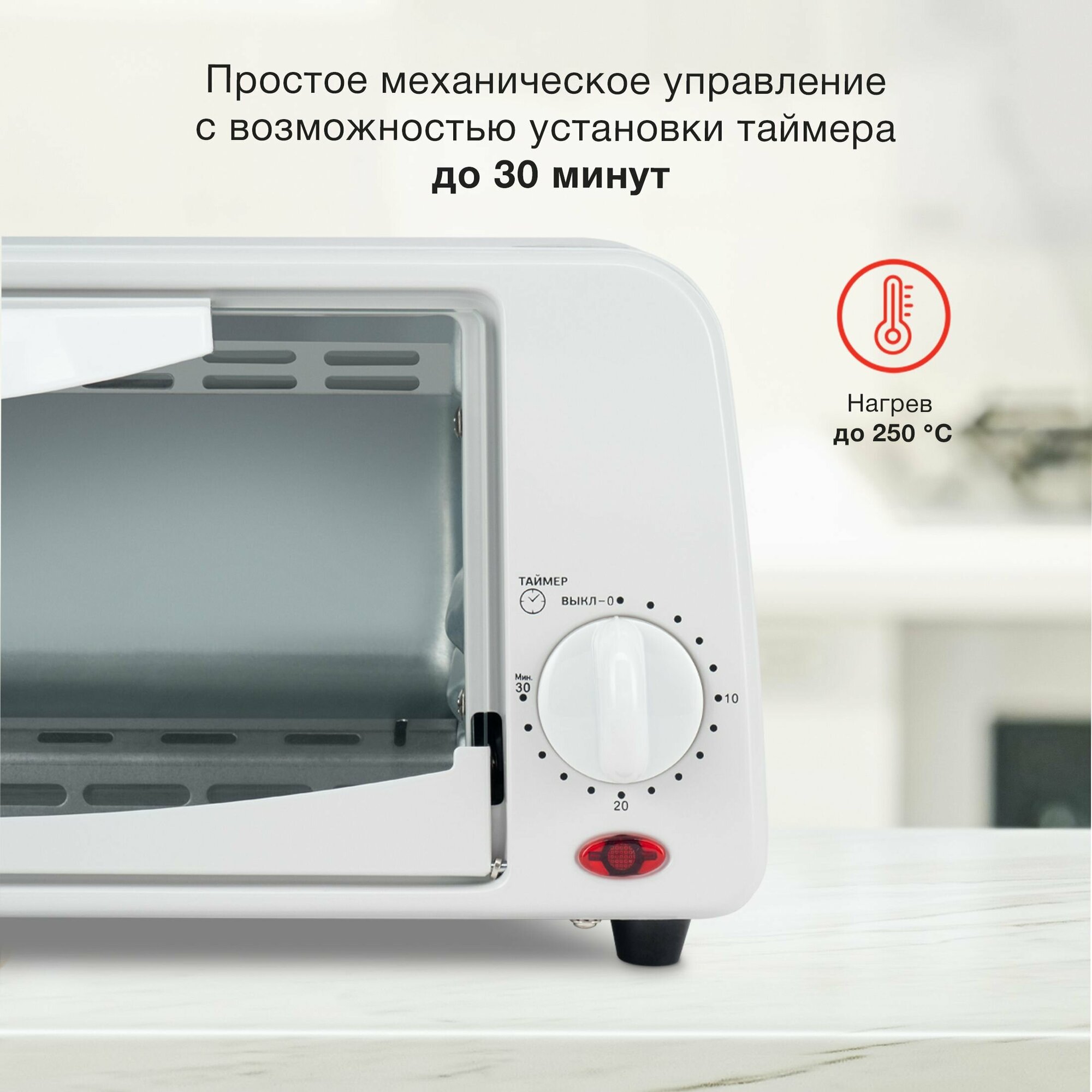 Модель мини-печи предназначена для приготовления пищи. Компактные размеры и небольшой вес прибора позволяют брать ее с собой на дачу или в отпуск. Работа устройства предусмотрена от сети. Мини-печь представлена в белом корпусе и отличается современным дизайном, который позволяет ее удачно вписать в любую обстановку. Объем рабочей камеры равен 6 литрам. Управление техникой осуществляется при помощи поворотного переключателя. В модели предусмотрен таймер, а температура терморегулятора ограничивается 250 градусами по Цельсию. Комплект поставки включает съемную решетку и противень. Во время работы печи на корпусе светится лампочка. Дверца прибора оснащена жаропрочным стеклом, открывается по направлению вниз за ручку.