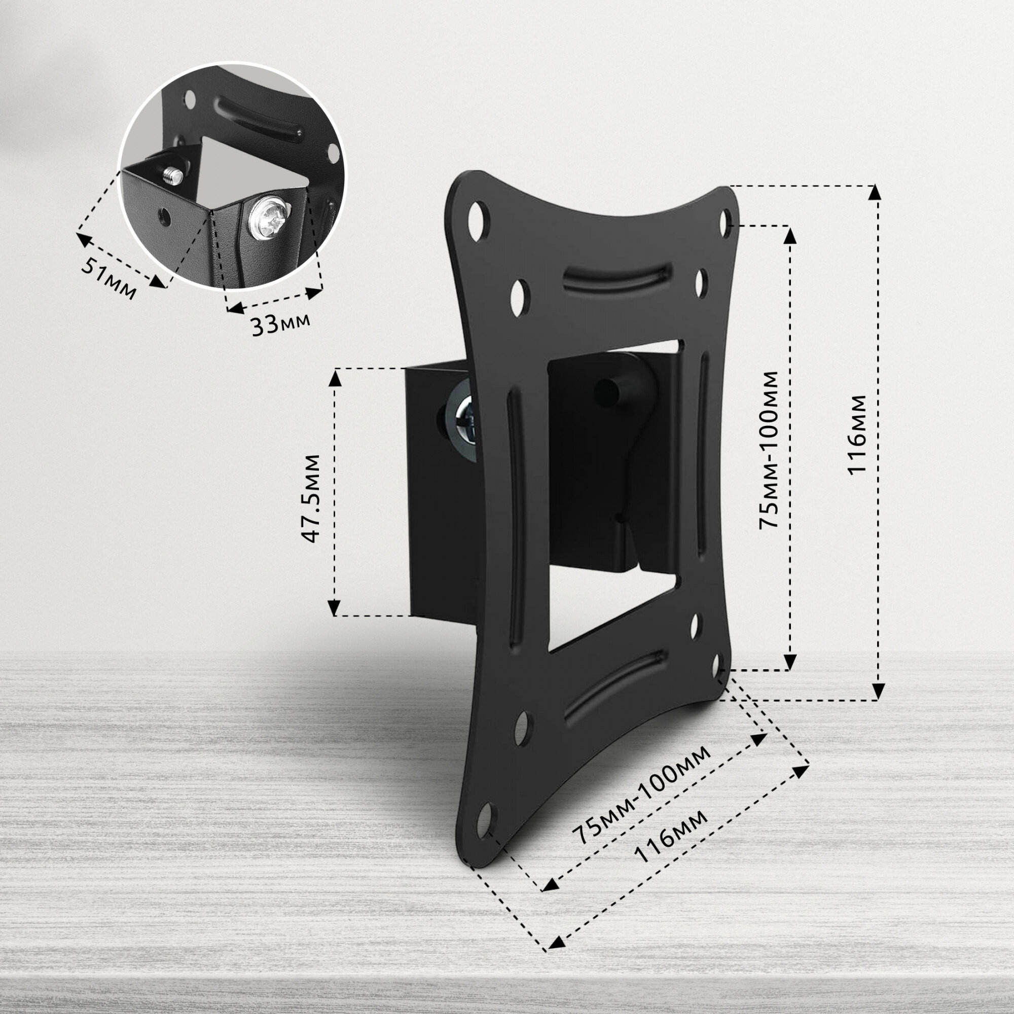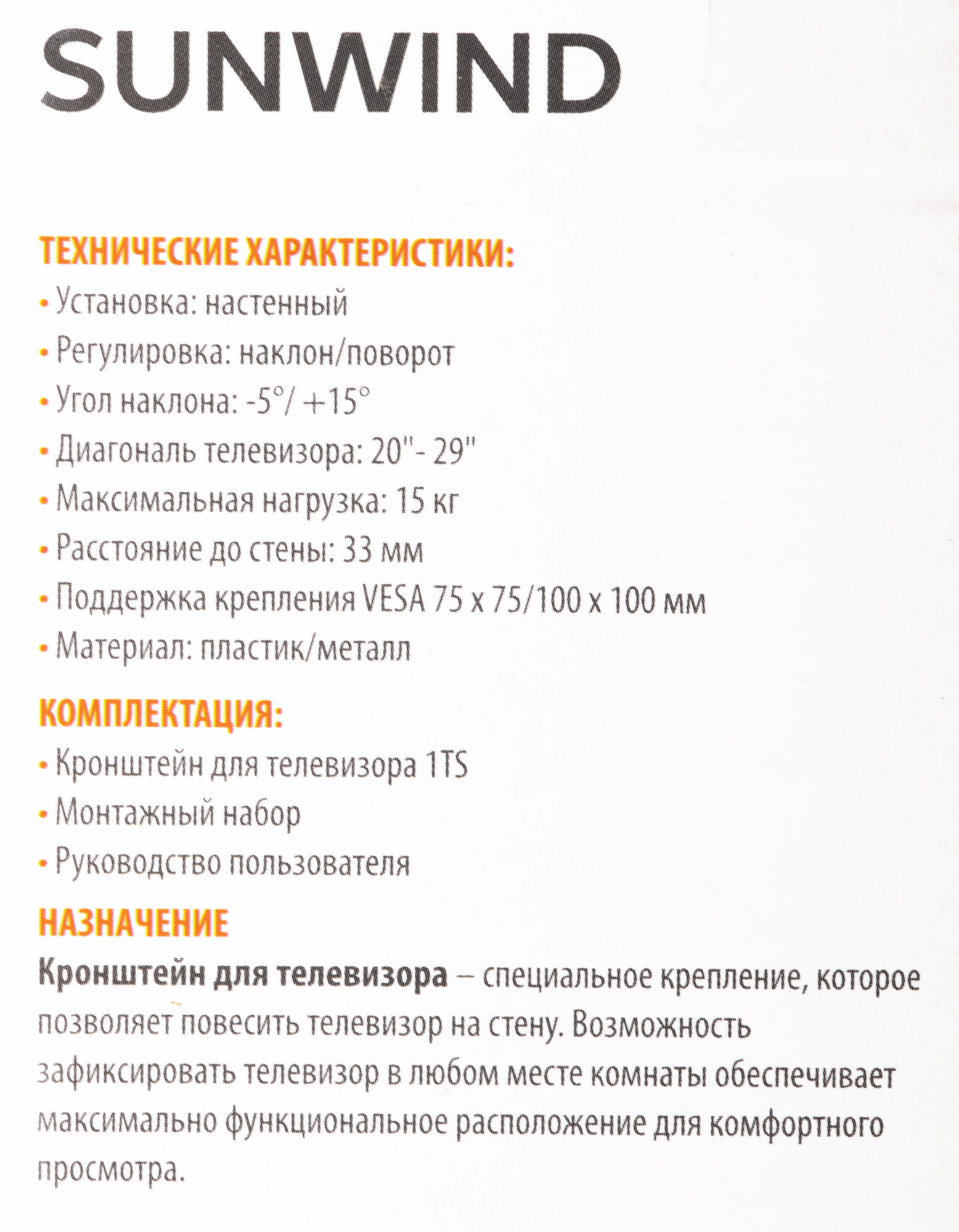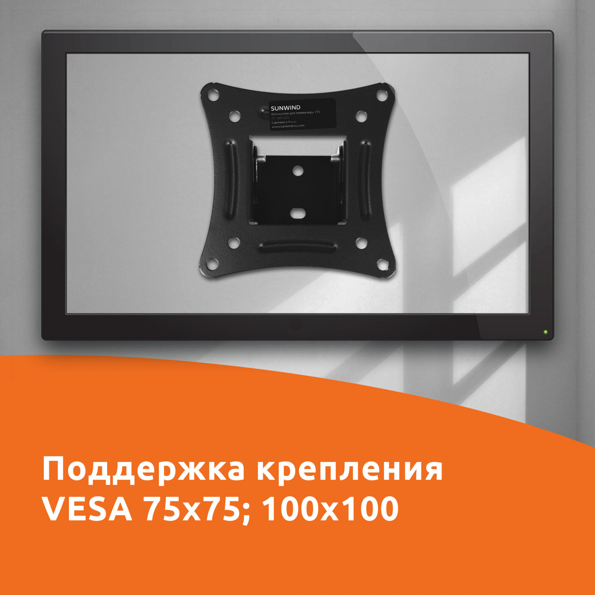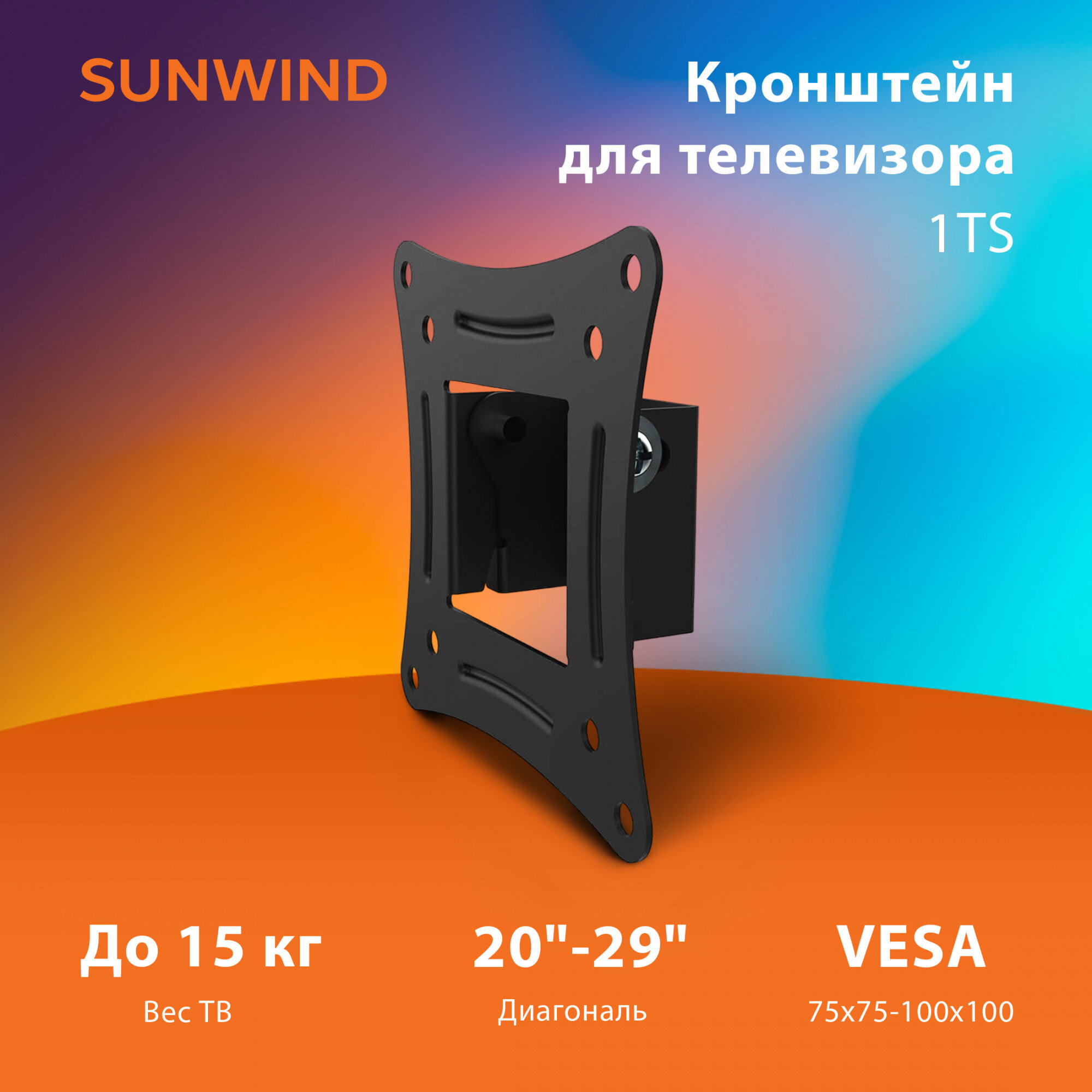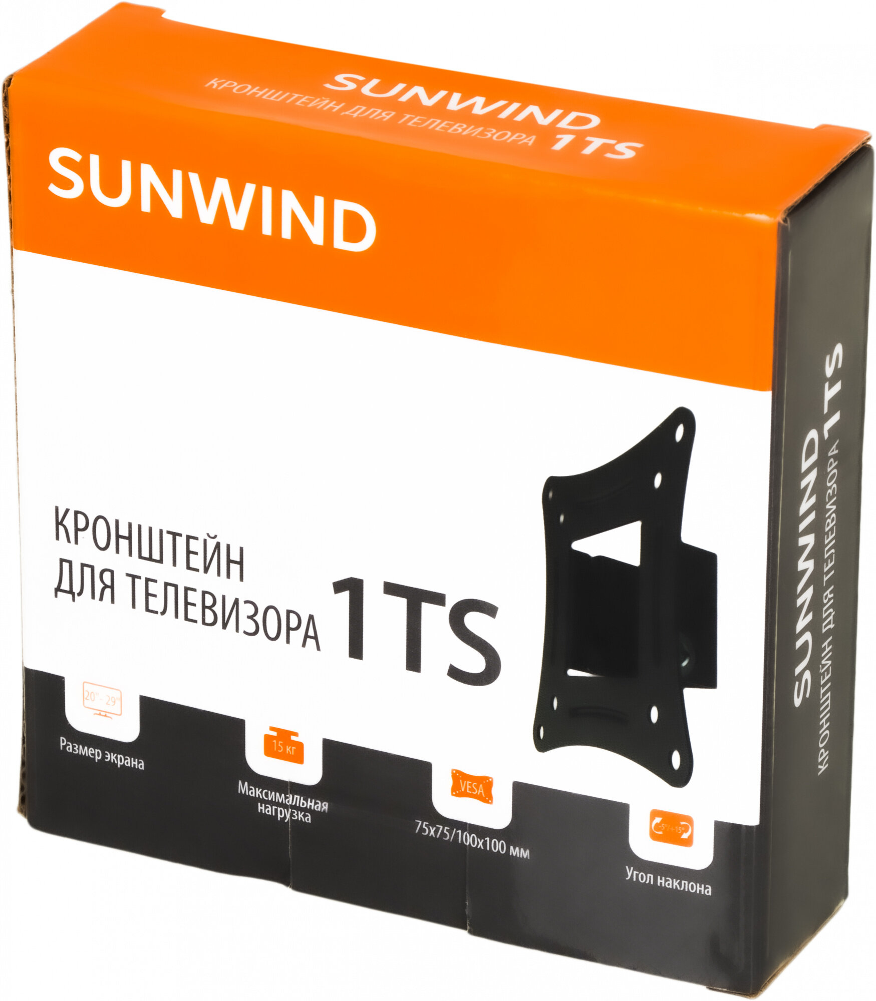 Кронштейн SunWind 1TS — устройство для надежной установки ЖК-телевизоров и мониторов на стене. Наклонный механизм обеспечивает удобный просмотр изображения из любого места комнаты. Особенности Оснащен наклонной системой, угол наклона варьируется от -5 до +15 градусов, что позволяет максимально точно откорректировать положение телевизора в пространстве.Благодаря продуманной конструкции закрепить телевизионный приемник можно на расстоянии всего 3.3 см от стены.Предназначен для установки плоских телевизоров с диагональю от 20 до 29 дюймов. Надежность и универсальность Крепление выполнено из стали высокого качества, устойчивой к механическим воздействиям и появлению ржавчины, обеспечивая продолжительной срок эксплуатации. Кронштейн рассчитан на нагрузку до 15 кг, что позволяет закрепить на стене даже тяжелый телевизор с большой диагональю. Универсальная панель VESA с монтажными отверстиями 75x75 и 100x100 мм подходит для разных моделей.