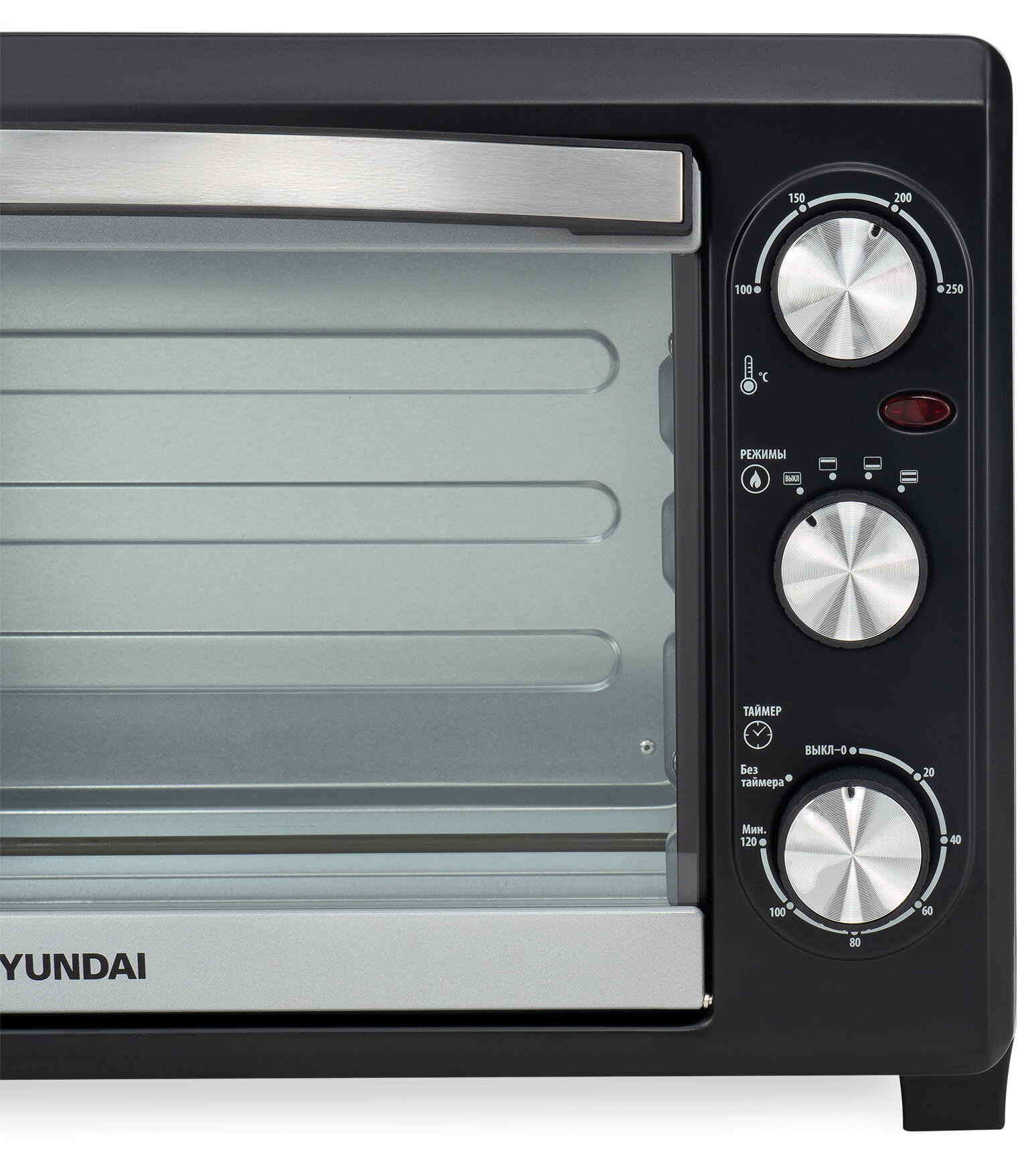 Миниатюрная печь Hyundai MIO-HY073 так же функциональна, как полноценный духовой шкаф, но занимает гораздо меньше места. Прибор по габаритным размерам больше напоминает микроволновую печь, чем духовку. Он помещается на стандартную столешницу и благодаря этому превосходно впишется в кухню любого размера. Его корпус окрашен в стильный металлик с добавлением чёрного – такой дизайн универсален и подходит под любой интерьер. Функции Hyundai MIO-HY073 не ограничиваются подачей жара в определенной конфигурации. Термически обрабатывать в ней пищу можно разными способами: снизу, сверху или с обеих сторон сразу. Температура также регулируется и варьируется до 250 градусов. Для настройки каждого из этих параметров есть отдельный круглый регулятор. Помимо них, данная модель поддерживает и работу по таймеру, он также имеет свой собственный орган управления с градуировкой до 120 минут. Благодаря оптимальной используемой мощности 1500 Ватт Hyundai MIO-HY073 быстро нагревается до рабочей температуры и экономного расходует электричество. О готовности устройства к работе сообщает световой индикатор на его лицевой панели. Внутренний объём мини-печи – 26 литров. Этого пространства хватит даже для блюд, рассчитанных на большую семью из нескольких человек. Следить за приготовлением пищи в реальном времени можно через стеклянную дверцу устройства. Стекло не только даёт полный обзор, но и отлично удерживает жар. Ножки Hyundai MIO-HY073 выполнены из нескользящей резины, так что данная модель будет устойчиво держаться, куда бы её ни поставили.