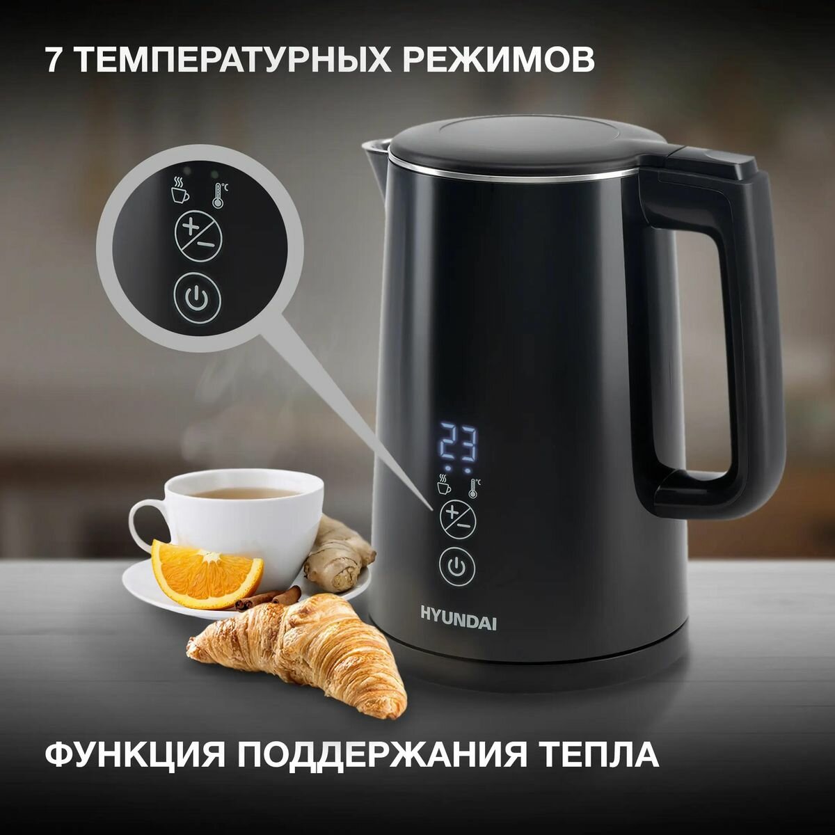 Электрический чайник Hyundai HYK-S5509 в строгом и элегантном черном цвете – современное устройство, сочетающее в себе высокую производительность, интеллектуальное управление и продуманный дизайн. Мощность в 2200 Вт обеспечивает быстрый нагрев воды, а объем в 1.5 литра – достаточное количество для приготовления напитков на несколько человек. Внешний корпус из термостойкого пластика обеспечивает защиту от случайных ожогов при прикосновении, а внутренний из нержавеющей стали не впитывает запахи и не выделяет вредных примесей. Благодаря такой конструкции достигается эффект термоса, позволяя воде дольше оставаться теплой после кипячения. Hyundai HYK-S5509 оснащен информационным LED-дисплеем, который отображает текущую температуру воды в чайнике. Сенсорное Touch-управление в одно касание обеспечивает простую регулировку всех настроек. Чайник предлагает 8 режимов, что позволяет точно подобрать температуру для приготовления различных видов чая, кофе и других напитков. Функция поддержания температуры воды позволяет сохранить ее горячей в течение длительного времени. Скрытый нагревательный элемент уменьшает время закипания и облегчает уход за чайником, а функция автоматического отключения и защита от включения без воды обеспечивают безопасность использования. Удобная подставка с вращением на 360 градусов делает использование чайника еще более комфортным, а кнопка открытия крышки упрощает процесс наполнения водой.