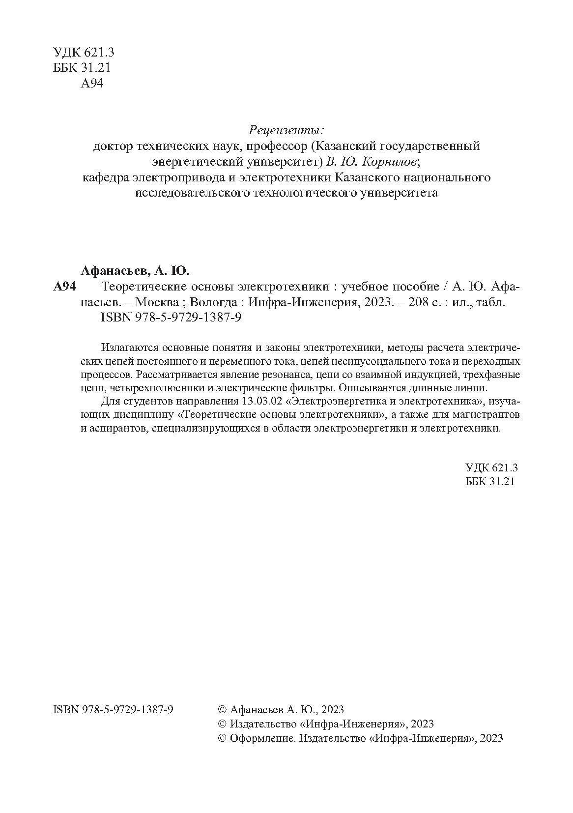 Теоретические основы электротехники. Учебное пособие (Анатолий Юрьевич Афанасьев); Инфра-Инженерия, 2023