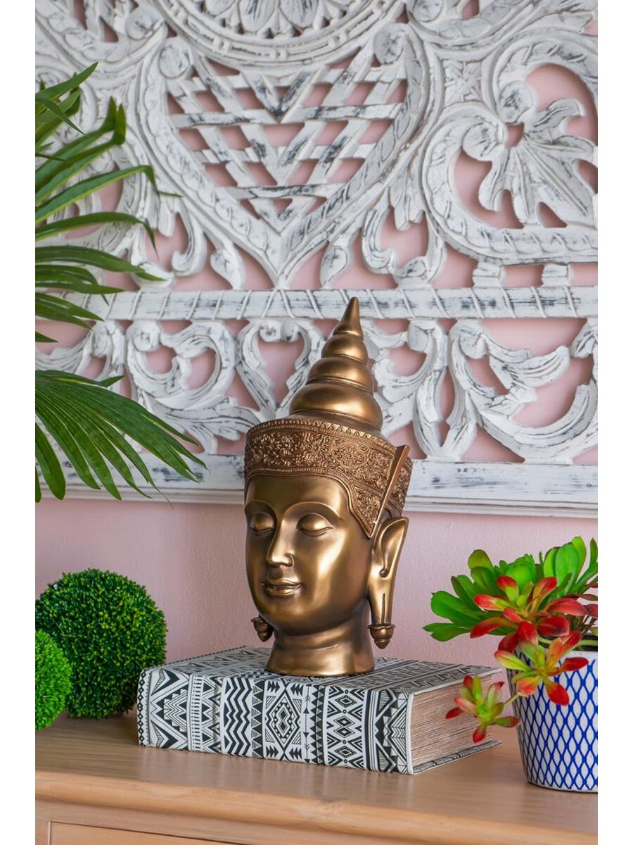 Вдохновляйтесь в любом месте вашего дома с этой безмятежной скульптурой головы Будды. Золотистая расцветка и богатая текстура украсит любой интерьер, привлекая внимание к своей необычной форме. Размер: 16х19х36см. Материал: Полирезина. Вес изделия: 1,4 кг. Компания "GLASAR" более 30 лет радует своих покупателей эксклюзивной продукцией для создания неподражаемого стиля, красоты и уюта в каждом доме. Ассортимент коллекционных изделий позволит подобрать товары в одной цветовой гамме для создания дизайнерских композиций. Фигурки, статуэтки и бюсты представлены в различном ассортименте: настольные, напольные, интерьерные, декоративные, под старину. Различные конфигурации и цвета привлекут внимание ваших гостей, создавая акцентную деталь в интерьере вашего дома. Фигурки, статуэтки и бюсты выполнены из различных материалов: фарфор, керамика, бронза, полисмолы, пластик, железо и другие. Это универсальный декор для комнаты, дома, дачи, коттеджа, квартиры, студии, салона красоты, ресторана, кафе, который может стать центральным элементом в любом интерьере или дополнит его стильной деталью. Изделие великолепно украсит ваш интерьер в гостиной, спальне, прихожей, коридоре, зале, холле, столовой, детской, на кухне или в любом другом пространстве вашего дома, разместите его в офисе или в зоне ресепшен. Фигурки, статуэтки и бюсты - это отличный подарок маме, папе, бабушке, дедушке, любимой, любимому, мужу, жене, дочке, сыну, сестре, брату, тете, дяде, подруге, другу, коллеге, директору. Прекрасный повод преподнести его на юбилей, день рождения, свадьбу, новоселье, 8 марта, 23 февраля, Новый год, Рождество.