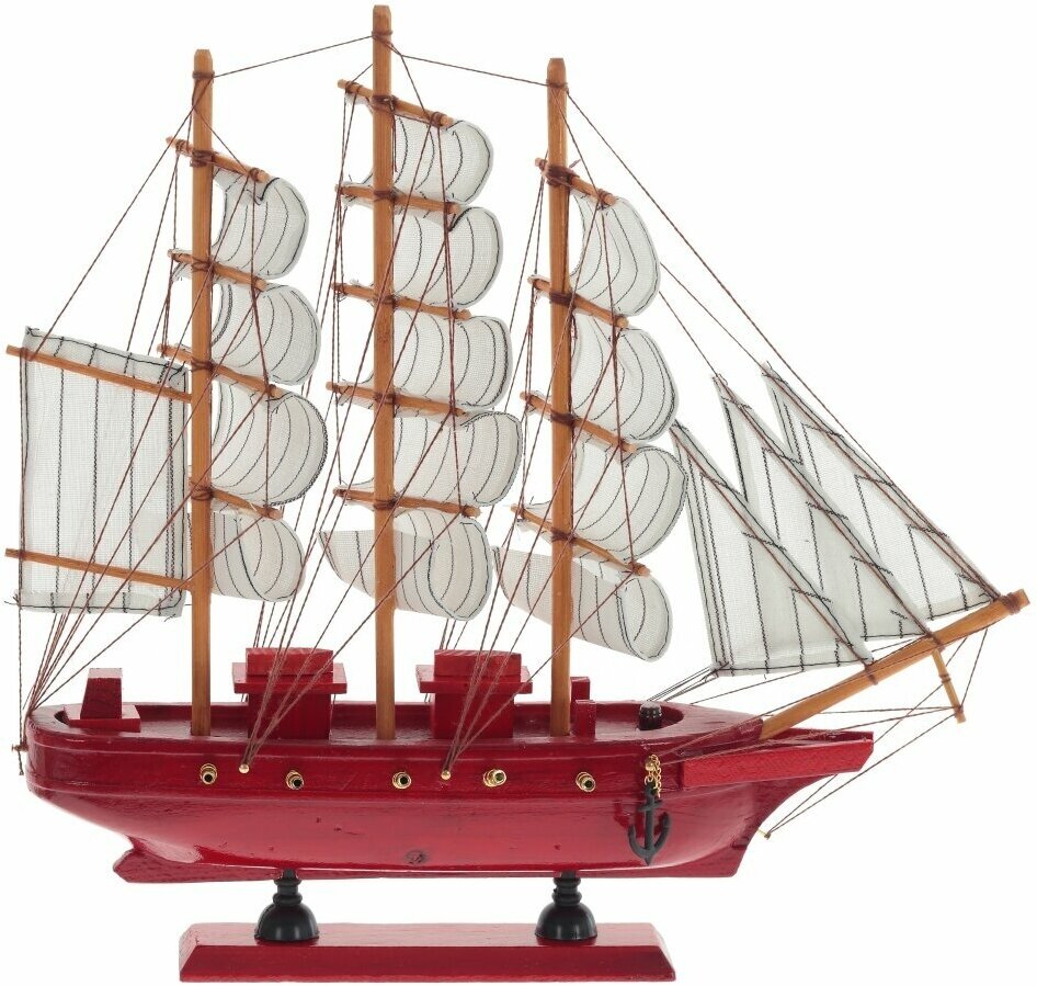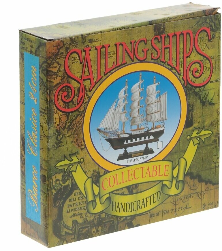 Модель деревянного парусника реалистична, состоит из множества мелких подробных деталей. Корабль устойчиво стоит на горизонтальных поверхностях благодаря широкой деревянной подставке.