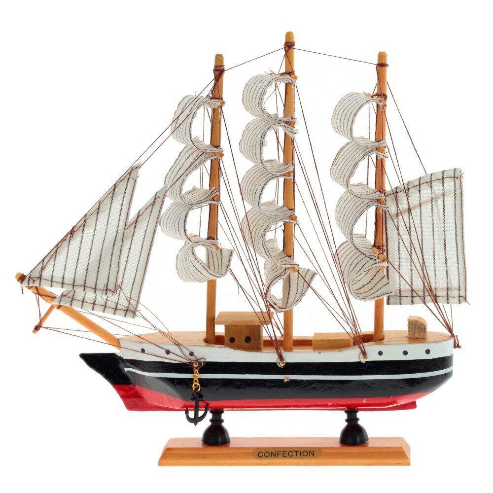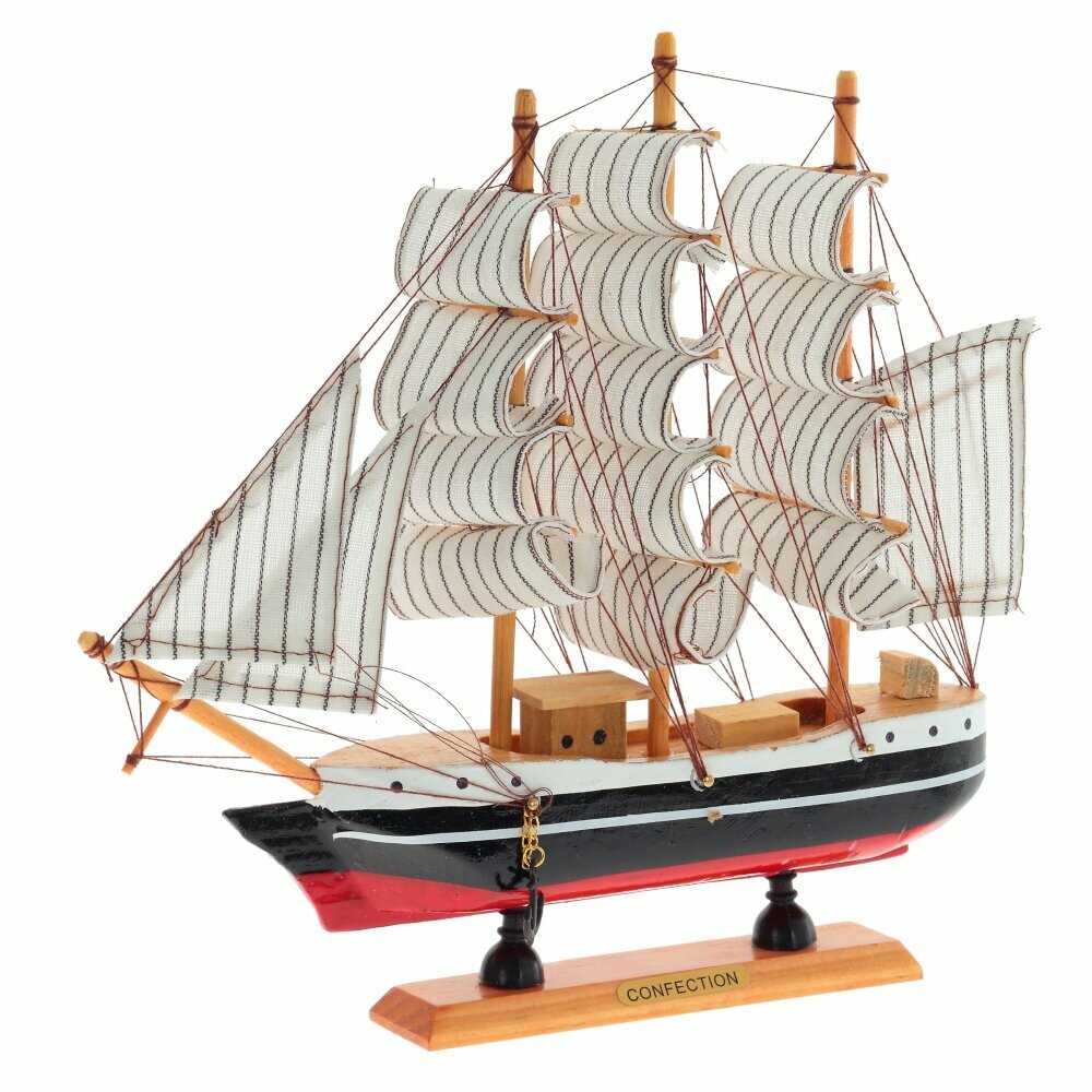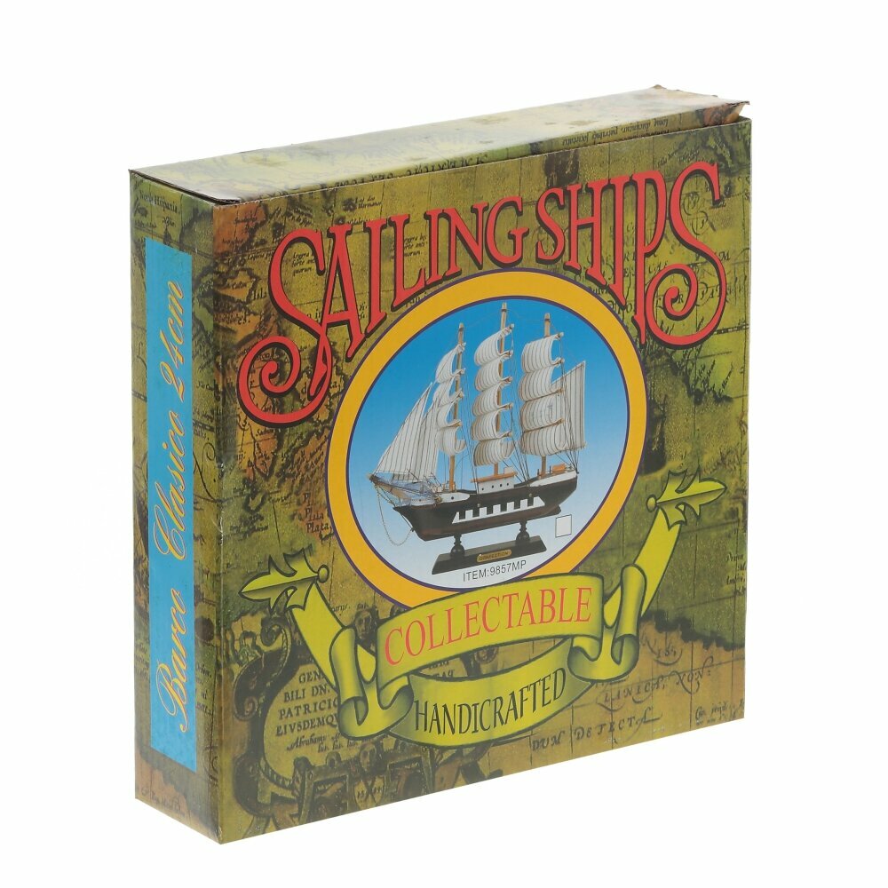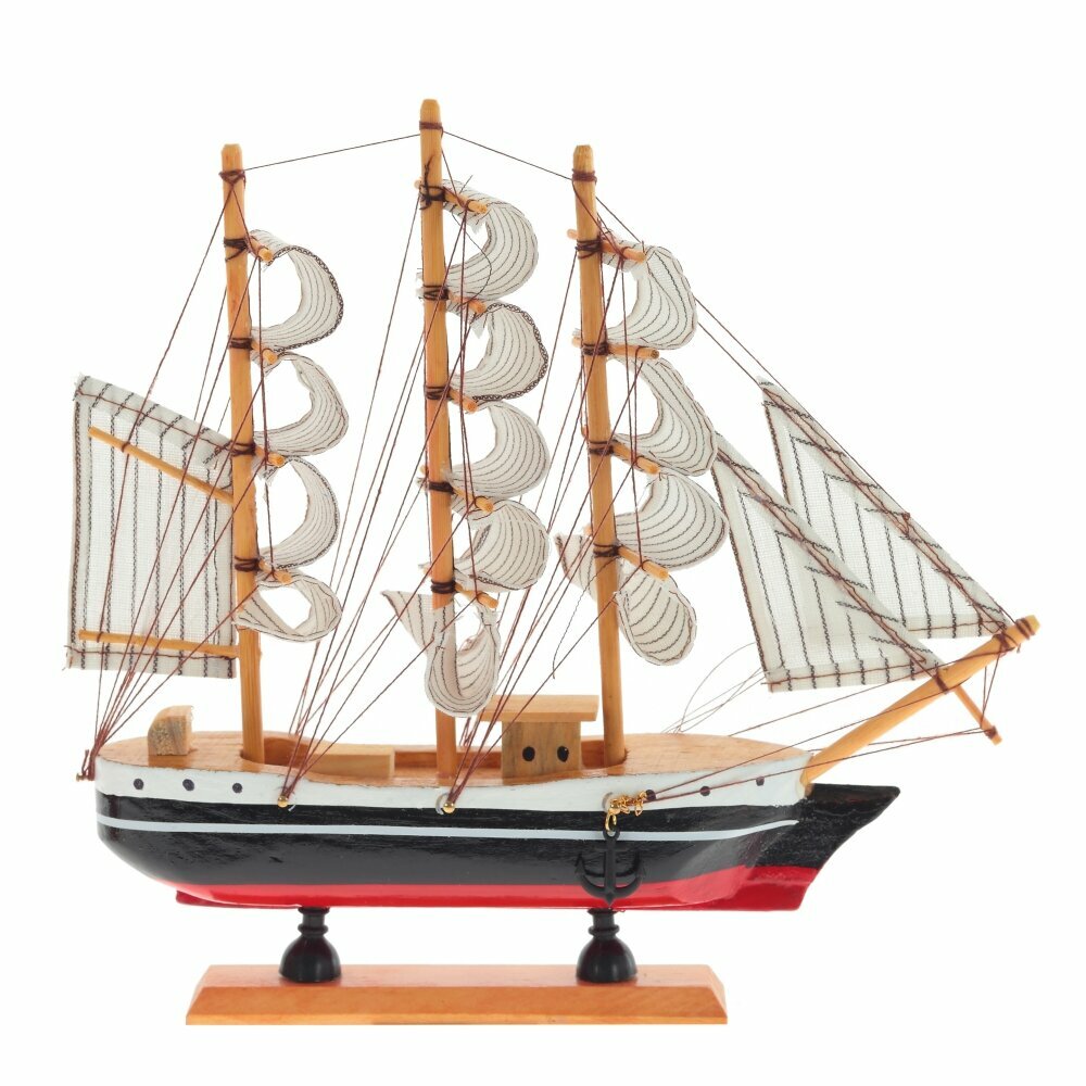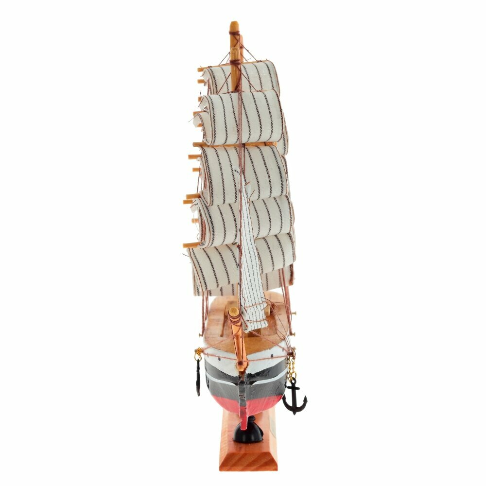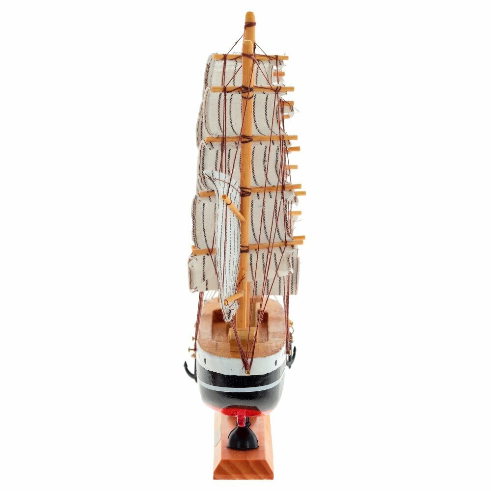Модель деревянного парусника реалистична, состоит из множества мелких подробных деталей. Корабль устойчиво стоит на горизонтальных поверхностях благодаря широкой деревянной подставке.