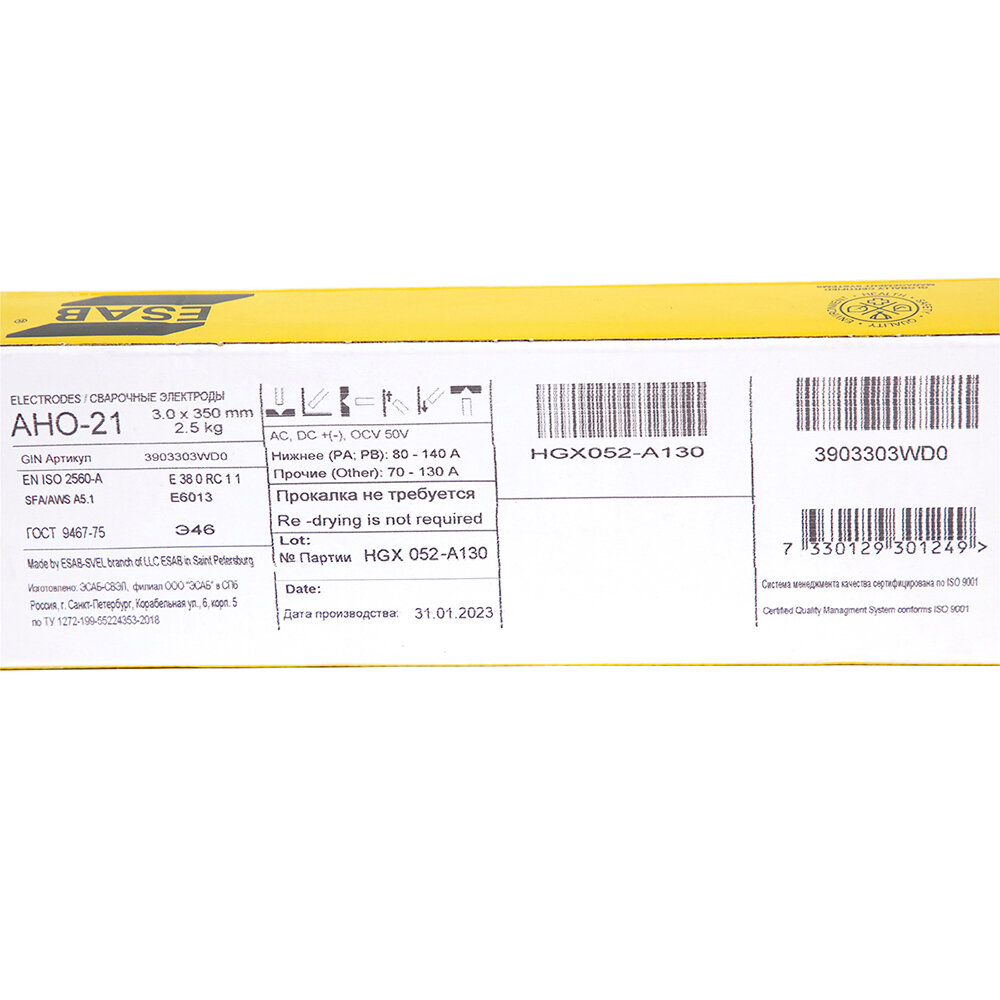Сварочные электроды АНО-21 (3.0x350 мм; 5.3 кг) ESAB 3903303WM0 - рутиловые электроды для сварки деталей во всех пространственных положениях как на постоянном, так и переменном токе. Внимание, изображение товара может отличаться от реального! Верные параметры указаны в технических характеристиках товара.