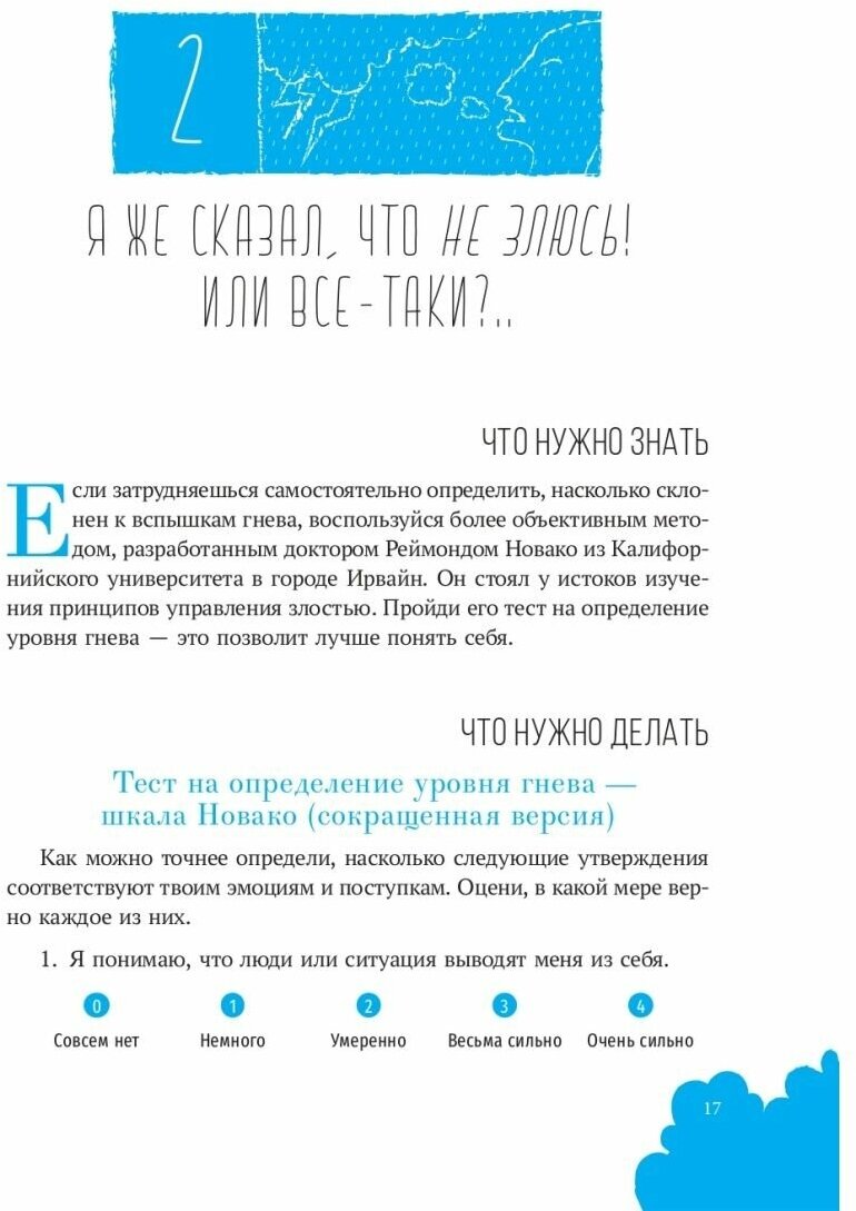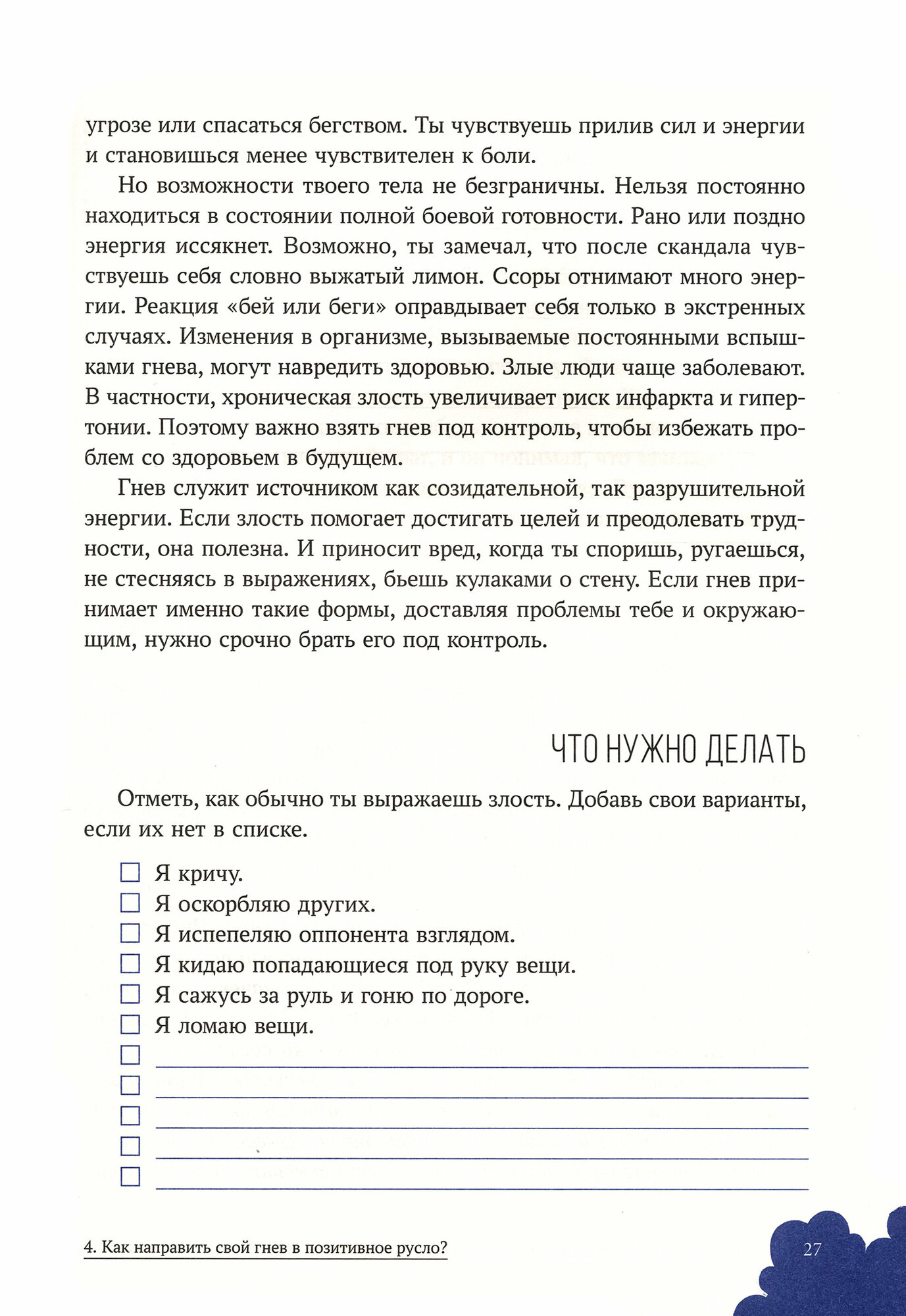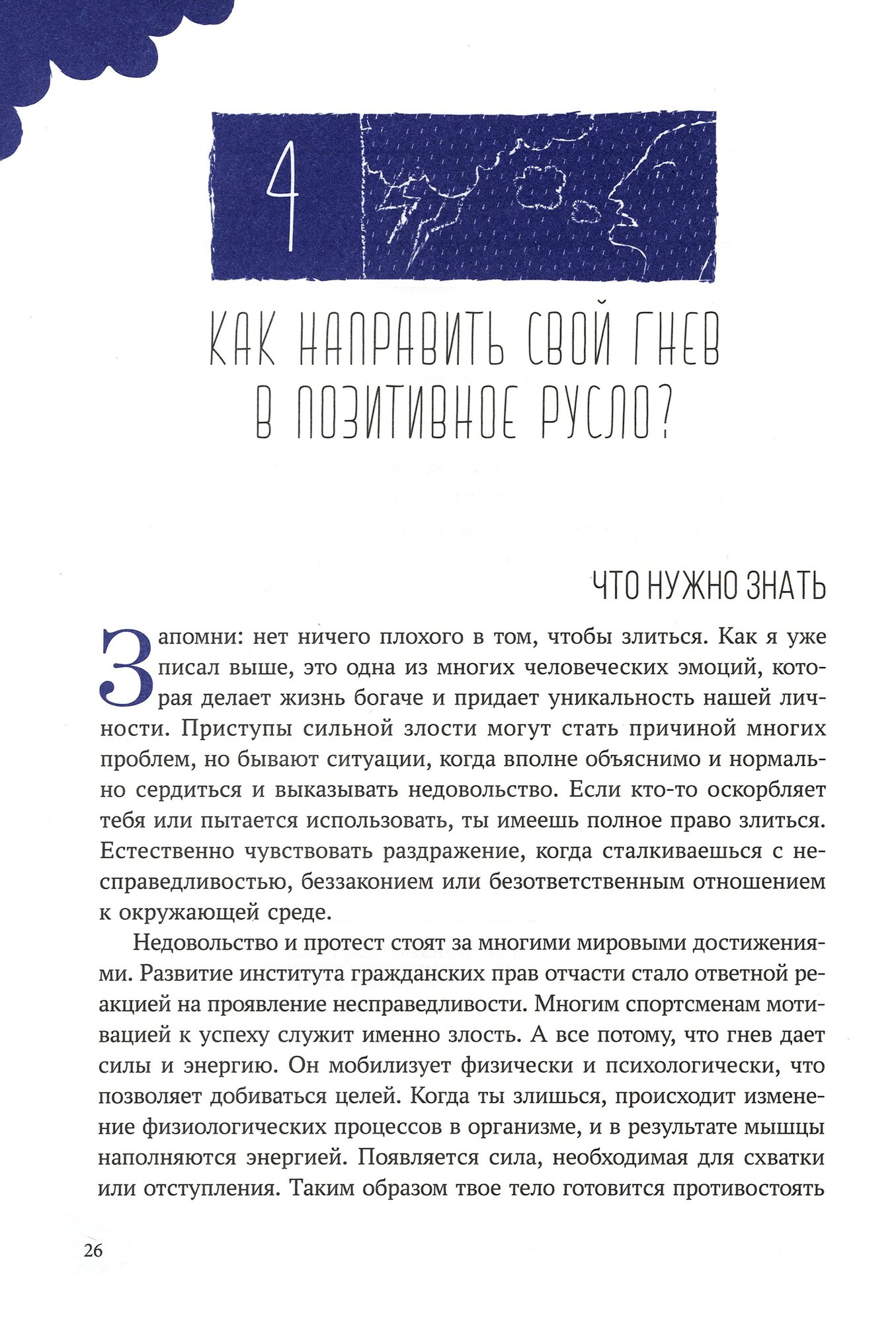 Быть подростком довольно трудно: много обязанностей, учеба, необходимость определиться с будущим, желание выделиться среди сверстников, стремление, чтобы взрослые считались с твоим мнением на равных. И не всегда есть силы на то, чтобы справляться со всем этим. Зачастую эмоциональные переживания выливаются в гнев и раздражение, после которых ты испытываешь муки совести. Наше общество поощряет подавление чувств (как чрезмерной радости, так и грусти) — ты всегда должен быть спокоен и собран, т.е. удобен для окружающих. Возможно, в ответ на твои переживания тебе говорили что-то вроде «прекрати привлекать к себе внимание», «не делай из мухи слона» или «просто будь мужчиной». Однако ты не можешь вечно скрывать свои переживания. Это приведет к тому, что ты станешь еще более взрывным, конфликтным, нетерпимым к другим, нелюдимым или отчужденным. Эта рабочая тетрадь нужна для того, чтобы ты научился выражать свои эмоции, не подавлял их, но и не выглядел при этом неадекватно, не отталкивал от себя людей вспышками гнева или раздражения.