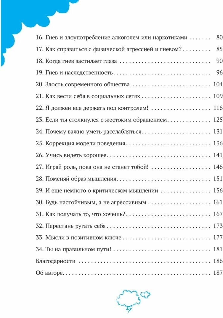 Нравится, что автор выбрал подход от "малого к большему" - сначала говорит о природе гнева, его физических проявлениях. Затем уже затрагивает серьезные темы: злоупотребление наркотиками, алкоголем. Также раскрыта тема насилия в семье.
