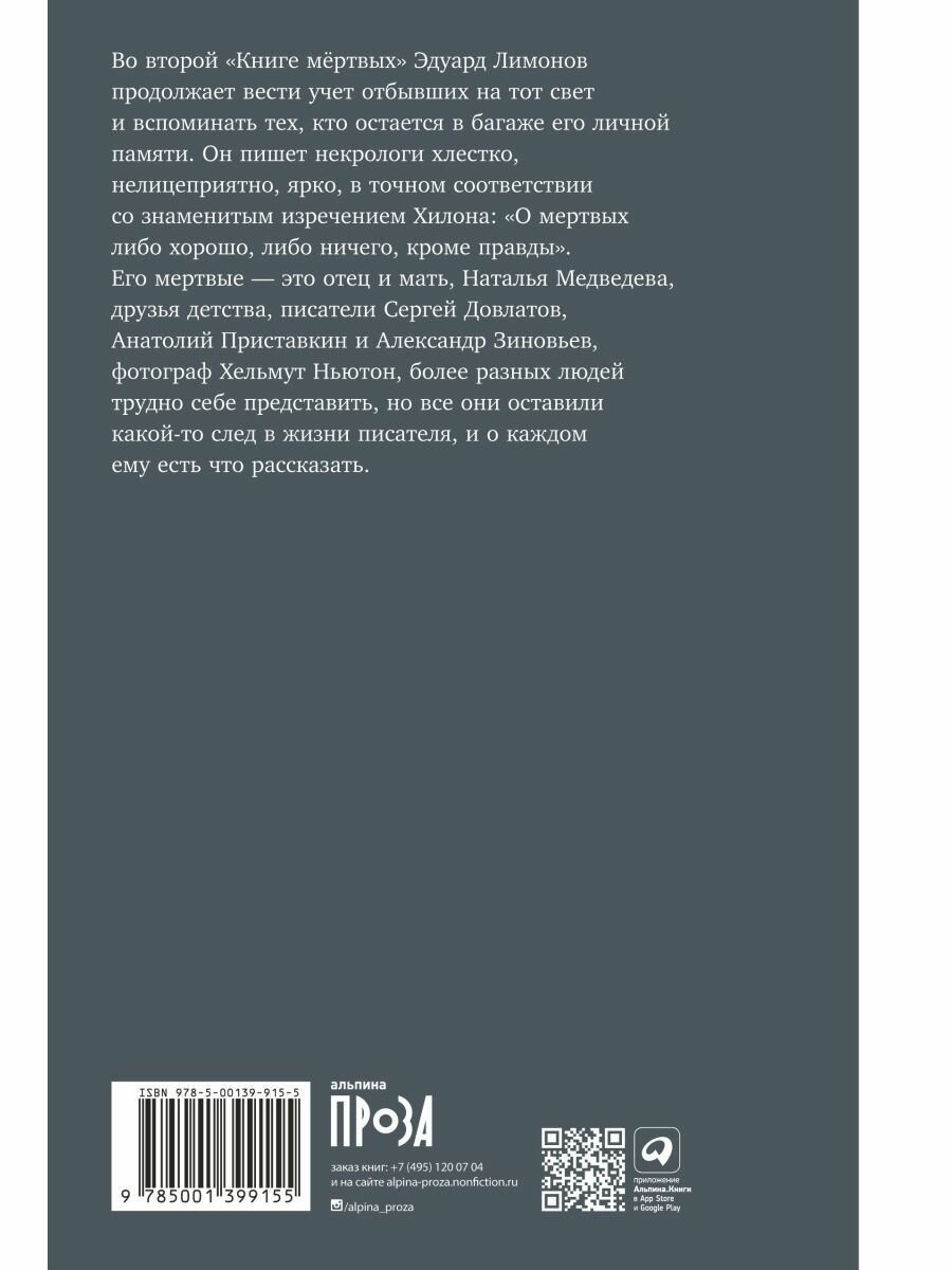 Во второй «Книге мёртвых» Эдуард Лимонов продолжает вести учет отбывших на тот свет и вспоминать тех, кто остается в багаже его личной памяти. Он пишет некрологи хлестко, нелицеприятно, ярко, в точном соответствии со знаменитым изречением Хилона: «О мертвых либо хорошо, либо ничего, кроме правды». Его мертвые — это отец и мать, Наталья Медведева, друзья детства, писатели Сергей Довлатов, Анатолий Приставкин и Александр Зиновьев, фотограф Хельмут Ньютон, более разных людей трудно себе представить, но все они оставили какой‑то след в жизни писателя, и о каждом ему есть что рассказать.