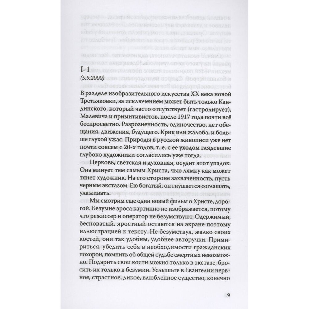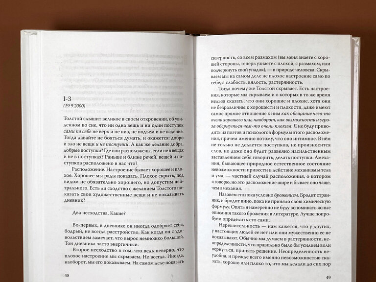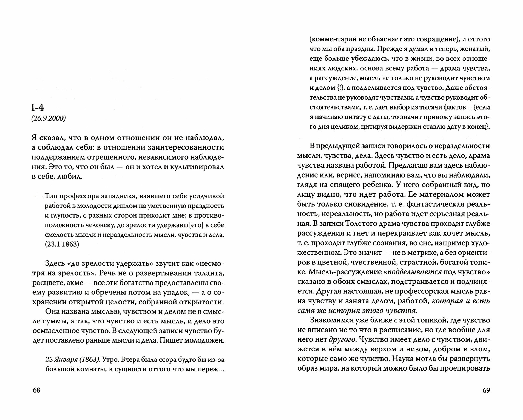 "Дневники Толстого и его записные книжки это вспышки озарений, и как человек чтобы быстро что-то записать хватает карандаш, гвоздь, так Толстой первые подвернувшиеся слова. Понятийный разбор этих записей даст нуль, единственный шанс - увидеть искру, всегда одну, которая ему осветила тьму и тут же погасла.… В основании всего, в разуме бытия, живого и он уверен что неживого тоже, он видит любовь и поэзию. Эти две вещи сумасшедшие, нерасчетливые, жертвенные, непредвиденные. Жизнь идет от них".