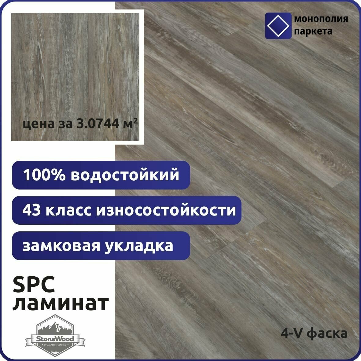 SPС ламинат StoneWood - это инновационный материал, сочетающий в себе твёрдость, практичность и износостойкость керамических материалов и текстуру натурального дерева! StoneWood идеально подходит для использования: в ванную, коммерческих помещениях, гостиную и прихожую. Почему стоит выбрать SPС ламинат StoneWood? Высокая твердость по сравнению с виниловыми продуктами. При эксплуатации StoneWood меньше подвержен вмятинам, царапинам и другим механическим повреждениям. За счет этого он отлично походит для коммерческих помещений с большой проходимостью. Декоры с фактурой натуральной древесины. Внешний вид уложенного паркета очень сложно отличить от реального деревянного пола. 43 класс износостойкости, обеспечивающий долговечность Срок службы в частных домах и квартирах - не менее 20 лет, в коммерческих помещениях - не менее 15 лет. Легкий монтаж. Продукцию StoneWood при минимальном обучении легко смонтирует человек, не имеющий опыта в укладке напольных покрытий. Отличная стабильность. Имеет минимальный коэффициент расширения, за счет чего может укладываться «плавающим» способом в помещениях с большой площадью. Теплоустойчивость. Подходит для использования в помещениях с системой подогрева пола. 100% водостойкость Подходит для использования во влажных помещениях, в том числе в ванных комнатах. Безопасен. Обладает низким коэффициентом скольжения. Удобный. Быстро и просто чистить. Устойчивость к воздействию солнечного света. Конструкция плитки из искусственного камня Stonewood Слой 1 – базовый слой, изготавливается в процессе смешивания порошка известняка, гранул ПВХ и фиксирующих добавок. За счет комбинирования известняка и ПВХ, материал приобретает очень высокие плотность (1980 кг/м3) и твердость (более 20 HB по шкале Бринелля), при этом имеет великолепную прочность. Он абсолютно безопасен для здоровья, не содержит формальдегиды, не имеет выраженного запаха. Слой 2 – декоративная пленка с фактурой настоящего дерева. При производстве STONEWOOD используется пленка самых лучших мировых производителей, что позволяет максимально передать реалистичность натурального дерева. Слой 3 – основной полиуретановый защитный слой. Толщина слоя равна 0,5 мм, что соответствует 43 классу износостойкости, принятому для ламинированных полов. Слой 4 – дополнительный защитный слой с ультрафиолетовой фиксацией. Обеспечивает дополнительную защиту от царапин и механических повреждений, облегчает уборку и снижает выцветание в процессе эксплуатации.