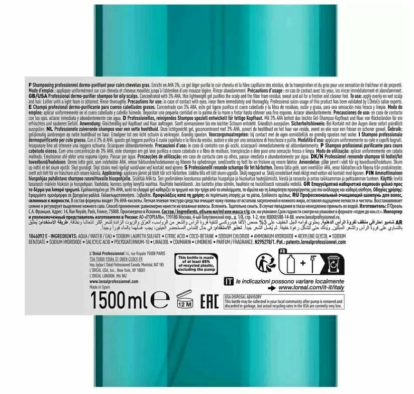 Шампунь Scalp Advanced для жирных волос 1500 мл L'oreal Professionnel (ЭХ99989439547)