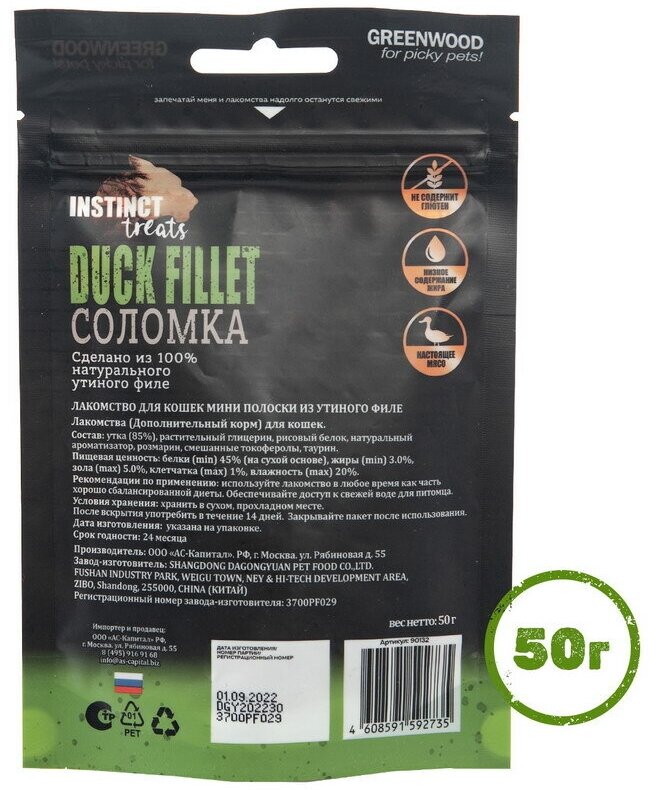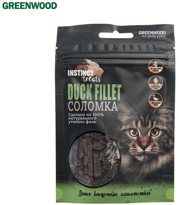 GREENWOOD INSTINCT TREATS Лакомство для кошек "Утиное филе" соломка 50гр Greenwood Treats (90132/GW)