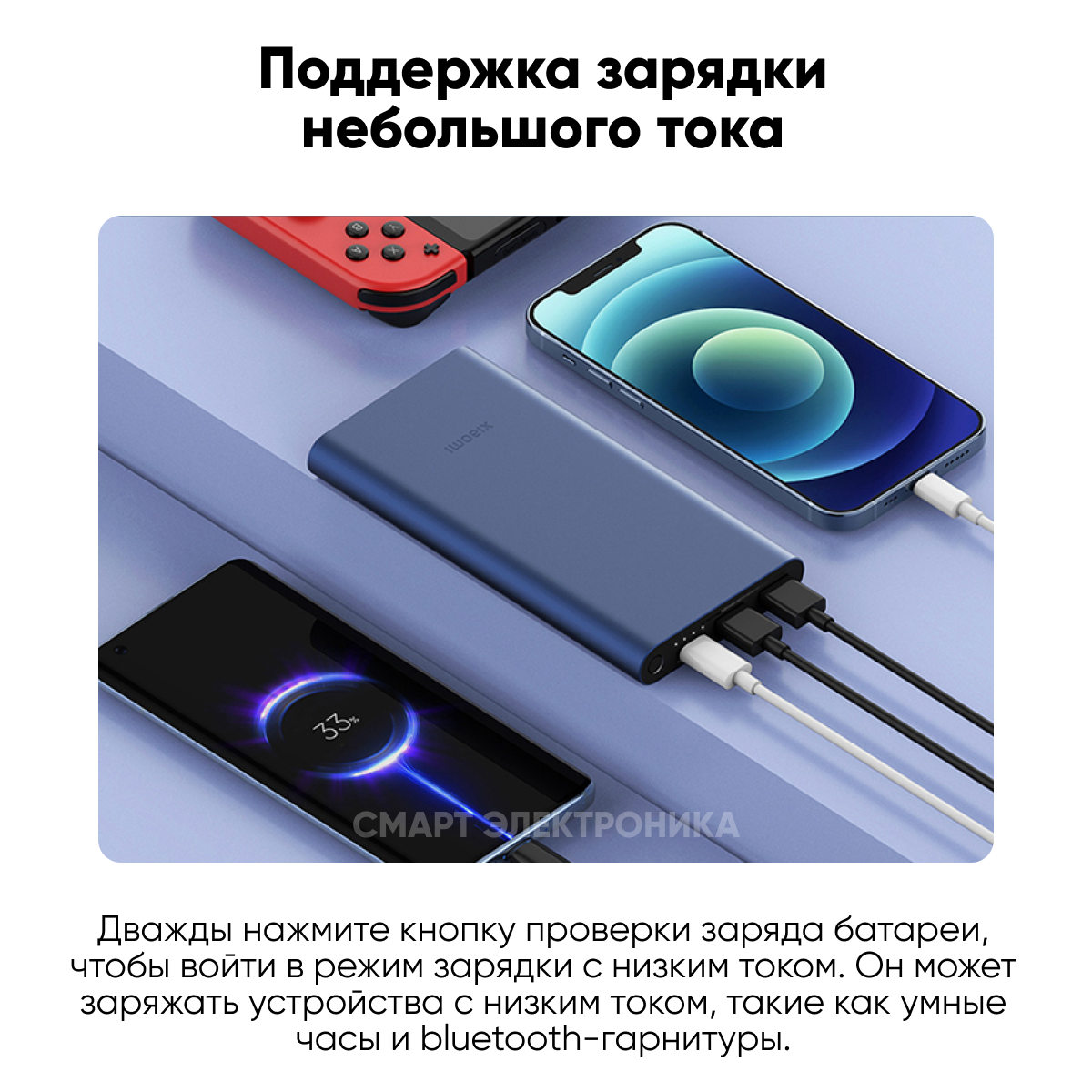 * Внешний аккумулятор также поддерживает слаботочную зарядку для Bluetooth-гарнитур и фитнес-браслетов от других производителей, помимо Xiaomi.