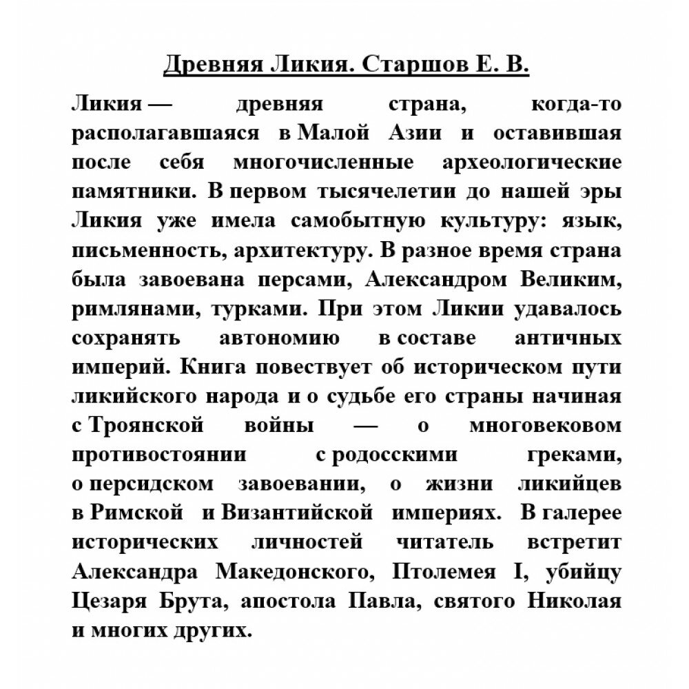 Вероятно, это первая книга на русском языке, которая даёт широкий обзор истории Ликии. Она очень актуальна, так как выпущена буквально только что. Написана лёгким языком, сочетая в себе достоинства научного и художественного издания. Где-то её можно использовать даже в качестве путеводителя.