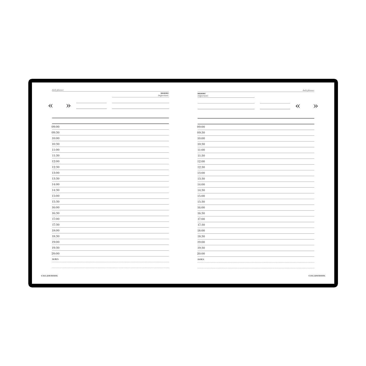 Раздел для планирования имеет линовку с временным интервалом в час от 9.00. до 20.00 и полем для фиксации даты и дня недели, важной информации.